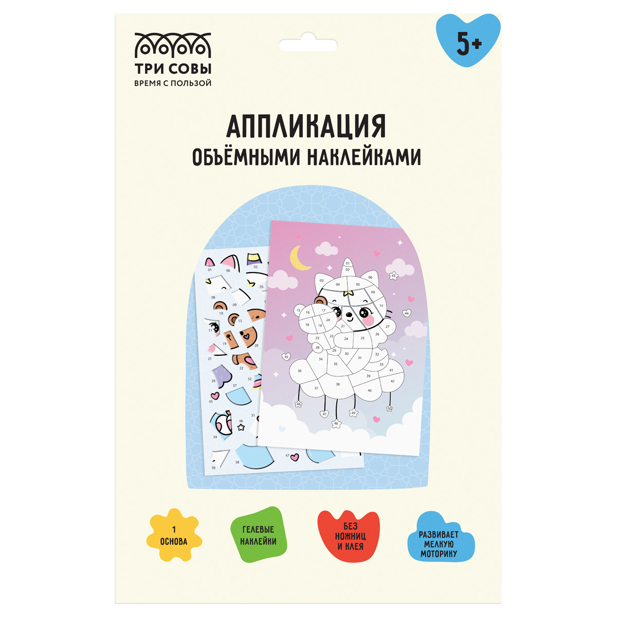 Набор для детского творчества «Аппликация наклейками» бренда «ТРИ СОВЫ» позволит ребенку с удовольствием и пользой провести время. Для создания аппликации «Котофея» не потребуется клея и ножниц. В набор входят: - 1 основа для аппликации из плотного картона - 1 блок с объемными наклейками Рекомендации по работе с набором: шаг 1 - подготовить рабочее место; шаг 2 - выбрать и отклеить элемент аппликации от блока с наклейками; шаг 3 - найти на основе-картинке область с такой же цифрой и приклеить элемент. Наклеенные на основу элементы создадут яркую и интересную картину, которую можно подарить близкому человеку или украсить комнату. Работая с аппликацией, ребенок активно развивает мелкую моторику, восприятие цвета и формы, пространственное и образно-логическое мышление, концентрацию внимания. «ТРИ СОВЫ» – время с пользой!