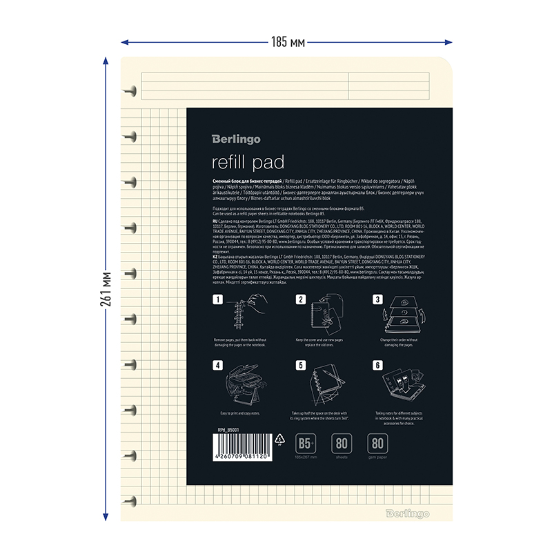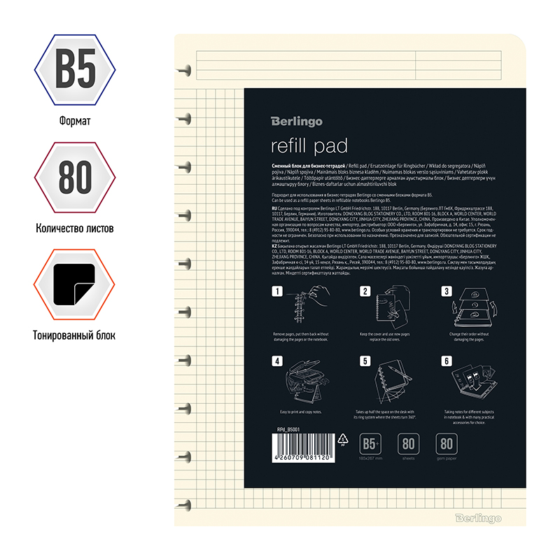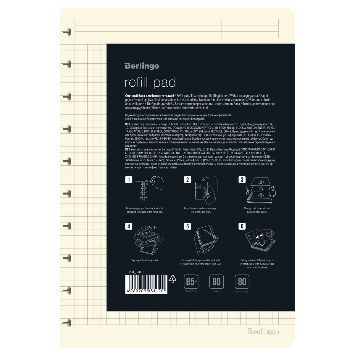 Блок сменный Berlingo для бизнес-тетрадей на кольцах подходит для для замены листов в тетрадях формата В5+. Плотность бумаги составляет 80 г/м2. Размер листа – 267*185*7,8 мм. В упаковке представлено 80 листов тонированной бумаги премиального качества. Блок бумаги упакован в прозрачный пакет с клеевым крае. Инструкция по замене блоков в комплекте. В упаковке представлена 1 штука. • Размер: 219*153*7,8 мм; • Количество листов: 80; • Цвет бумаги: тонированный; • Плотность бумаги: 80 г/м2.