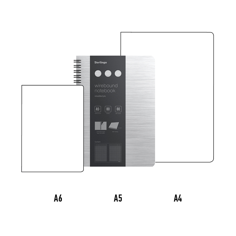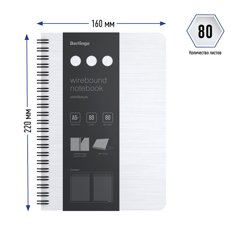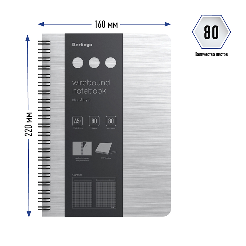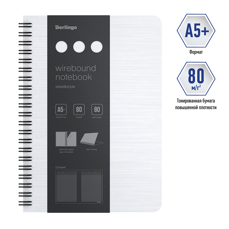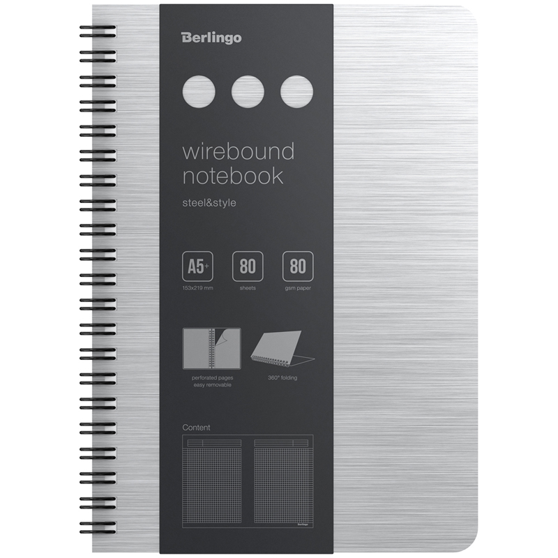 Бизнес-тетрадь Berlingo "Steel&Style" - это практичное, стильное и современное изделие для планирования и записей. Такая бизнес-тетрадь является незаменимым инструментом для деловых людей. Увеличенная толщина обложки (1500мкм) в сочетании с фактурой "сталь", формата А5+. Материал обложки - трехслойный пластик (полифом), надежно защищает внутренний блок от влаги, замятия и загрязнения, обложка устойчива к загрязнениям. Насыщенный цвет серебристый металлик внешней стороны, в сочетании с черным цветом внутренней поверхности. Вид скрепления – гребень со стильными черными кольцами, который дает возможность раскрывать тетрадь на 360⁰. Бизнес-тетрадь содержит съемную брендированную линейку, которую можно использовать как закладку или разделитель и с легкостью можно перемещать в удобное место. Внутренний блок – высококачественная тонированная бумага, плотностью 80г/м2, 80 листов в клетку, рамка для заголовка, темы или даты, поля с обеих сторон блока на каждом листе, линовка на вылет. Внутренний блок имеет микроперфор