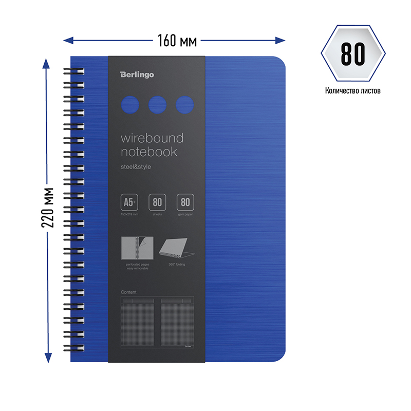 Бизнес-тетрадь Berlingo "Steel&Style" - это практичное, стильное и современное изделие для планирования и записей. Такая бизнес-тетрадь является незаменимым инструментом для деловых людей. Увеличенная толщина обложки (1500мкм) в сочетании с фактурой "сталь", формата А5+. Материал обложки - трехслойный пластик (полифом), надежно защищает внутренний блок от влаги, замятия и загрязнения, обложка устойчива к загрязнениям. Насыщенный синий цвет внешней стороны, в сочетании с черным цветом внутренней поверхности. Вид скрепления – гребень со стильными черными кольцами, который дает возможность раскрывать тетрадь на 360⁰. Бизнес-тетрадь содержит съемную брендированную линейку, которую можно использовать как закладку или разделитель и с легкостью можно перемещать в удобное место. Внутренний блок – высококачественная тонированная бумага, плотностью 80г/м2, 80 листов в клетку, рамка для заголовка, темы или даты, поля с обеих сторон блока на каждом листе, линовка на вылет. Внутренний блок имеет микроперфорацию для ровног