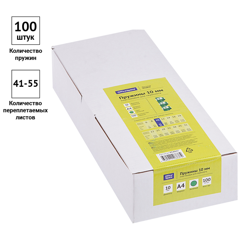 Пластиковые пружины OfficeSpace белого цвета диаметром 10мм предназначены для переплета документов. Легко выдерживают многократное раскрытие при необходимости добавить или удалить листы из готовой брошюры. Рекомендуемый объем брошюры при использовании данного диаметра пружины: 41-55 листов.