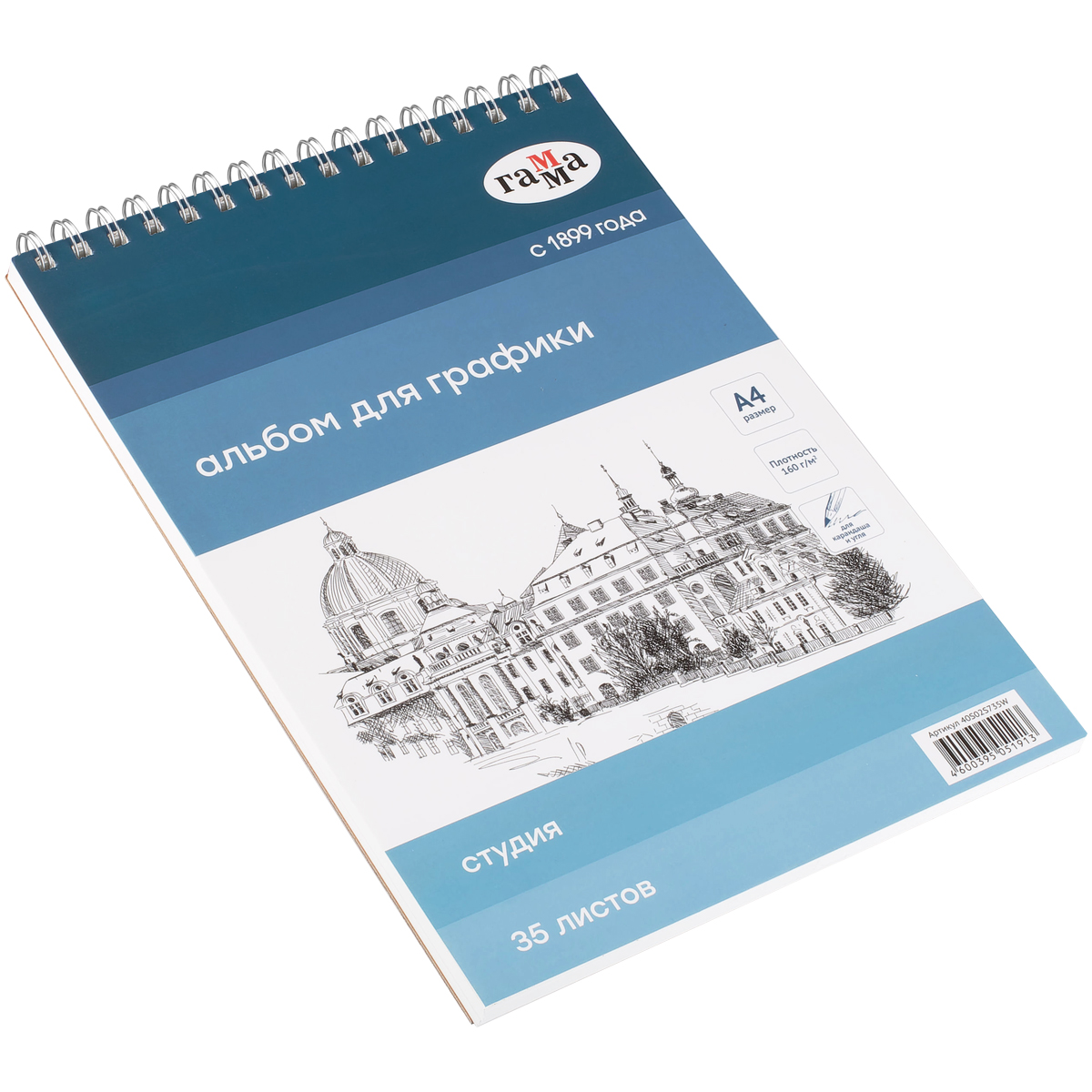 Альбом для графики ГАММА серии «Студия» формата А4 плотностью 160 г/м2". Бумага обладает естественным белым цветом. Предназначен для создания набросков и зарисовок мягкими графическими материалами: пастелью, соусом, сангиной, углем, ретушью, карандашом. • Формат: А4; • Кол-во листов: 35 листов; • Техника (назначение): для графики; • Внутренний блок: рисовальная бумага; • Плотность блока: 160 г/м2