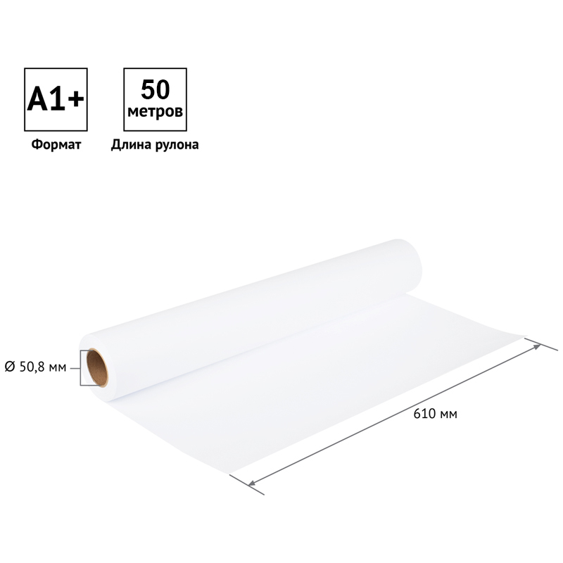 Бумага широкоформатная OfficeSpace без покрытия. Предназначена для печати чертежей, линейной графики, схем и других видов технической документации. Идеальна для печати черно-белой, а также отдельных видов цветной графики без передачи полутонов. Совместима со струйными черно-белыми плоттерами и принтерами большинства известных производителей: НP, Сanon, Еpson, Xerox, Kyocera, Mimaki, Philips, RICOH, Samsung и др. Размер бумажного полотна составляет 610 мм (24 in), что соответствует формату А1+. Длина рулона - 45,7 м (150 ft). Внутренний диаметр втулки - 50,8 мм. Плотность бумаги 90 г/м², белизна по CIE 146%. Для защиты от влаги и поддержания нормального уровня влажности рулон упакован в полиэтиленовую пленку. Размеры короба - 63×11,2×11,2 см