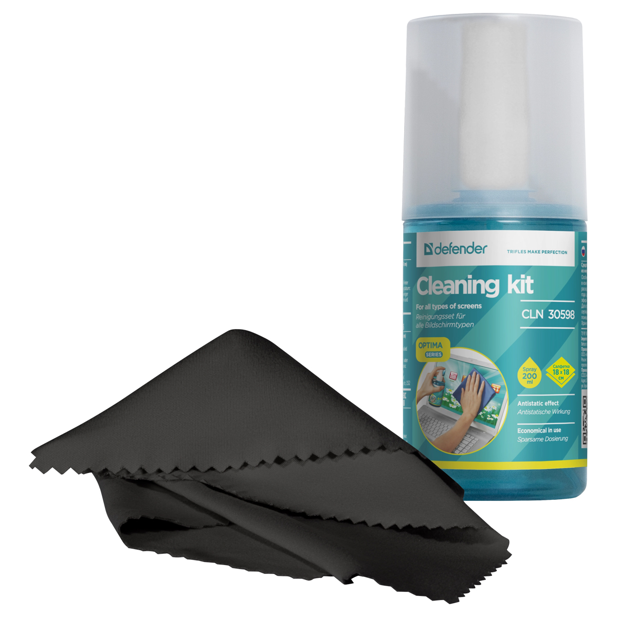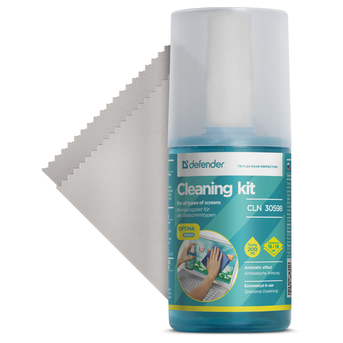 Очищающий спрей для экранов Defender CLN Optima 200мл в комплекте с салфеткой из микрофибры. Обеспечивает экономичное расходование. Подходит для экранов всех типов, стёкол, зеркал.
