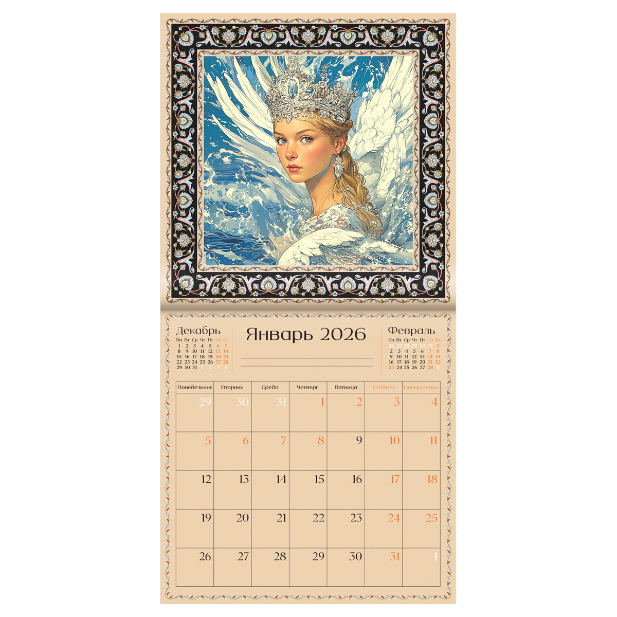 Настенный перекидной календарь на скрепке BG "Живопись" на 2026 год – это идеальное сочетание функциональности и эстетики, которое преобразит ваш интерьер. Размер 29*29 см. Изготовлен из мелованной бумаги плотностью 105 г\м2 с полноцветной печатью. Каждый из 12 месяцев оформлен уникальными иллюстрациями, что создаёт вдохновляющую атмосферу. Оптимальный размер календаря позволяет легко разместить его в любом помещении, а надежная скрепка обеспечивает простоту в использовании. Индивидуальная упаковка в пакет. Этот календарь станет не только практичным помощником для планирования важных дел, но и оригинальным подарком для друзей и коллег. Сделайте 2026 год незабываемым с календарями BG. • Размер: 290*290 мм; • Тип: настенный перекидной.