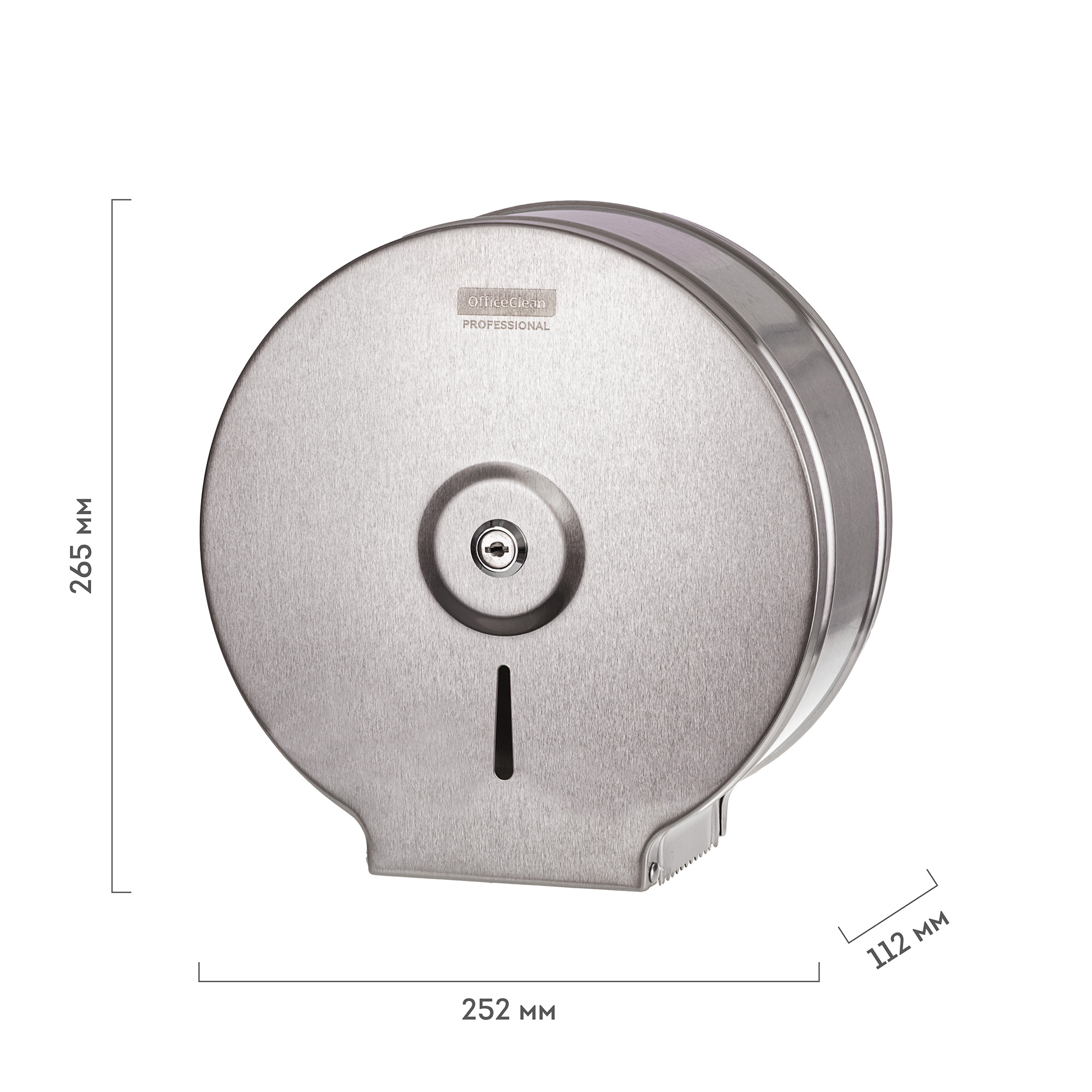 Удобно, стерильно, гигиенично – все это о диспенсере для туалетной бумаги OfficeClean Professional из нержавеющей стали. Товар органично впишется в помещение с любым дизайном, одновременно повышая уровень безопасности. Преимуществами товара являются простота в эксплуатации, надежность конструкции и обеспечение высокого уровня гигиены. Металлический антивандальный корпус станет оптимальным решением для туалетных комнат с большой проходимостью, поможет выдержать не только физическое воздействие, но и предотвратит кражу расходного материала. Вид расходных материалов: рулонный с втулкой. Обладает антивандальным корпусом. Вместимость: 1 пач./рулонов. Контроль остатка бумаги: да. Тип закрывания: металлический ключ. Удобные зубцы для бесконтактного отрыва бумаги: да. Сочетается с расходными материалами других производителей: да. Размещение: настенный. Комплектация: ключи, крепежные материалы. Материал замка: металл. Материал корпуса: металл. Цвет корпуса: нержавеющая сталь (глянцевый). Ширина: 252 мм. Диаметр втулки: 38 мм. Высота: 265 мм. Глубина: 112 мм.