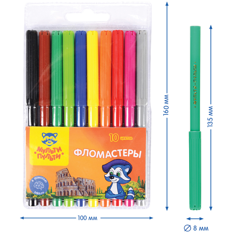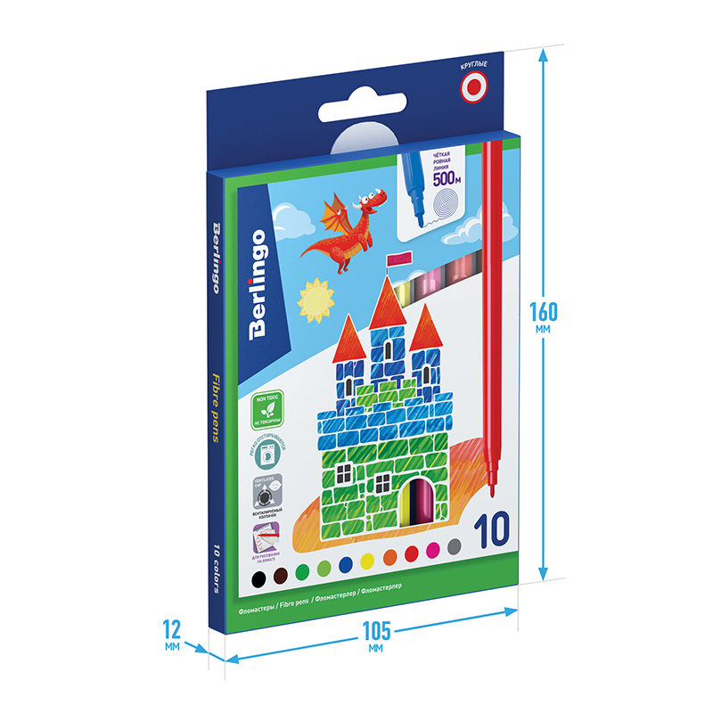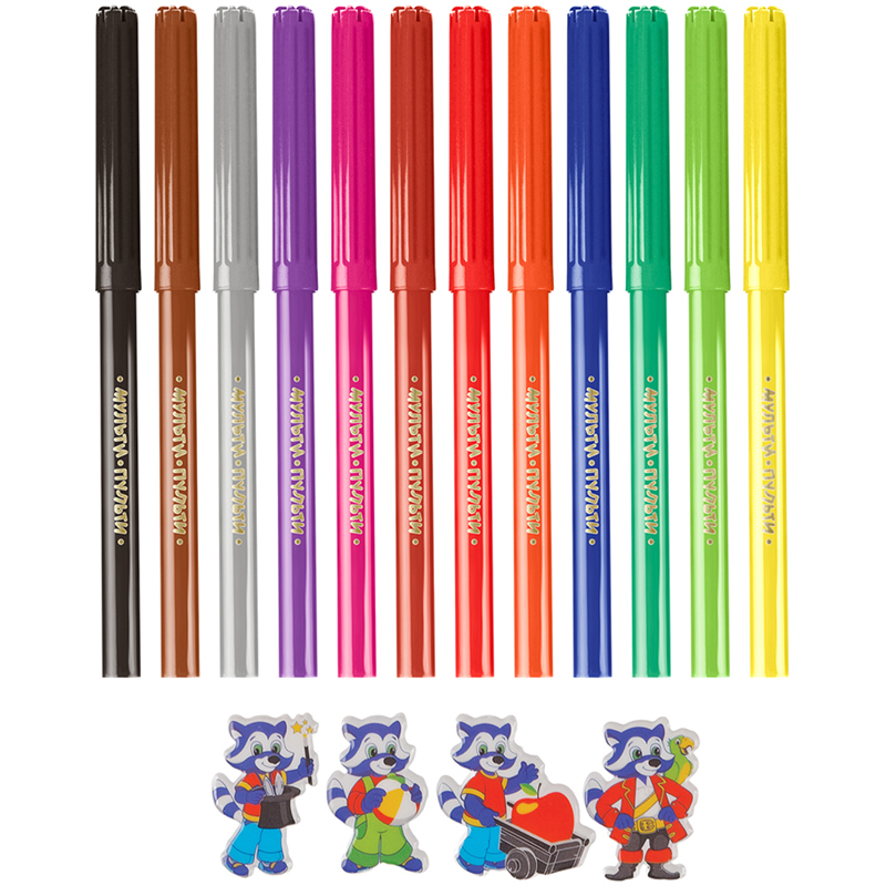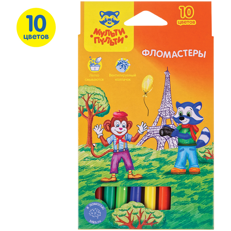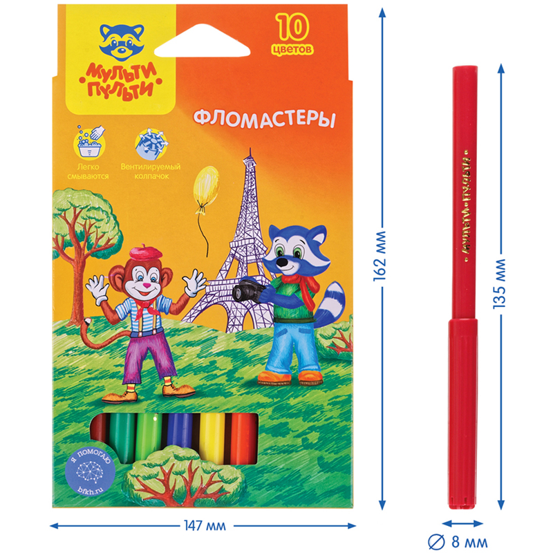 Легкосмываемые чернила, вентилируемый колпачок, не токсичны. На белых корпусах фломастеров нанесен оригинальный рисунок, который привлекает дополнительное внимание к продукции. Упаковка – блистер. Для детей старше 3-х лет.