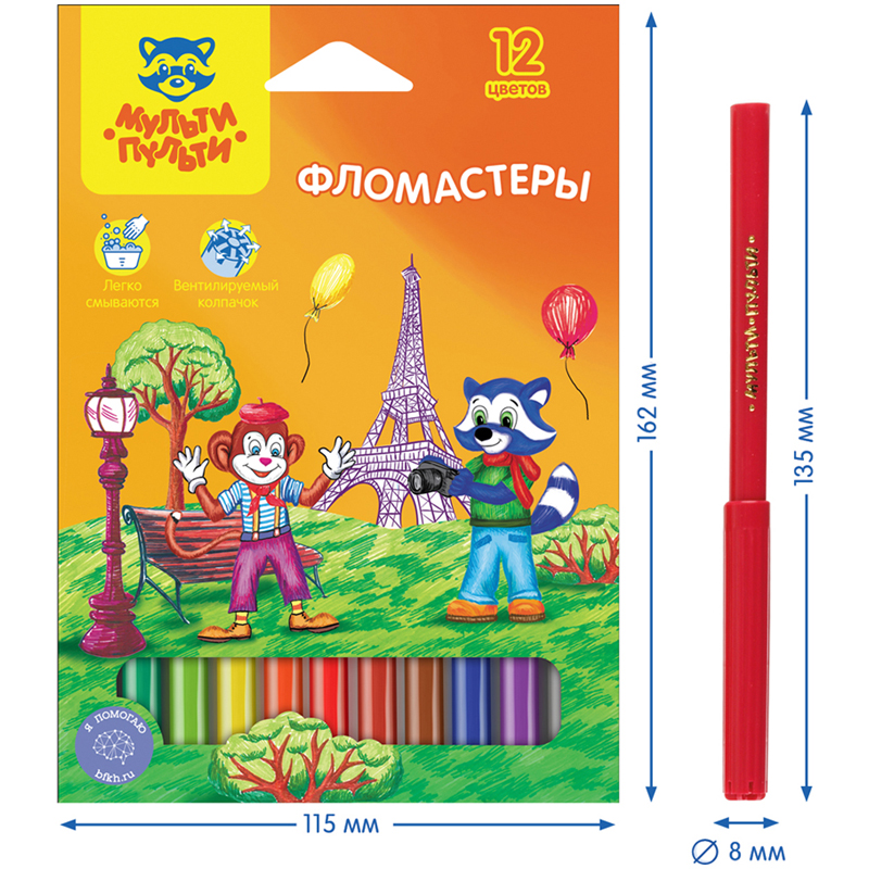 Фломастеры «Мульти-Пульти» серии «Енот во Франции» представлены с легкосмываемыми чернилами и вентилируемым колпачком. В наборе 12 цветов: чёрный, коричневый, серый, фиолетовый, розовый, бардовый, красный, оранжевый, синий, тёмно-зеленый, салатовый, жёлтый. Корпус круглой формы изготовлен из полипропилена и имеет удобную круглую зону захвата. Тип наконечника – конический. Толщина линии составляет 2 мм, длина письма – не менее 260 метров. Фломастеры сохраняют стабильный цвет при письме на протяжении всего использования. Смываемые фломастеры на водной основе нетоксичны. Упакованы в картонную коробку. • Количество цветов: 12; • Тип наконечника: конический; • Длина линии письма: 260 метров.