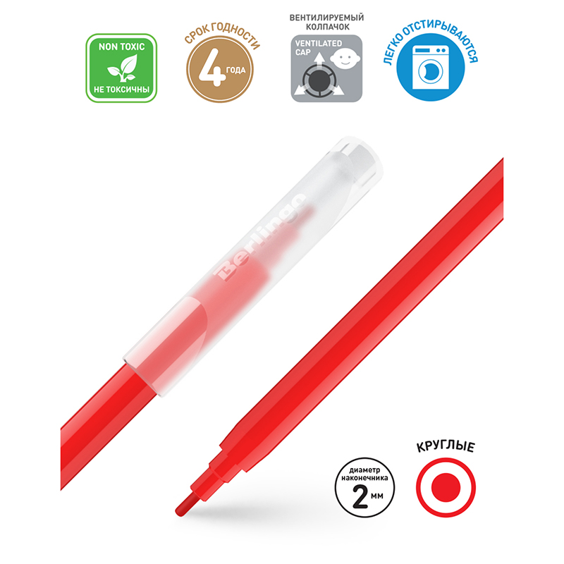 Легкосмываемые чернила, вентилируемый колпачок, нетоксичны, корпус изготовлен из полипропилена. Упакованы в блистер с петлей-европодвесом. Длина линии не менее 500 м. Для детей старше 3-х лет.