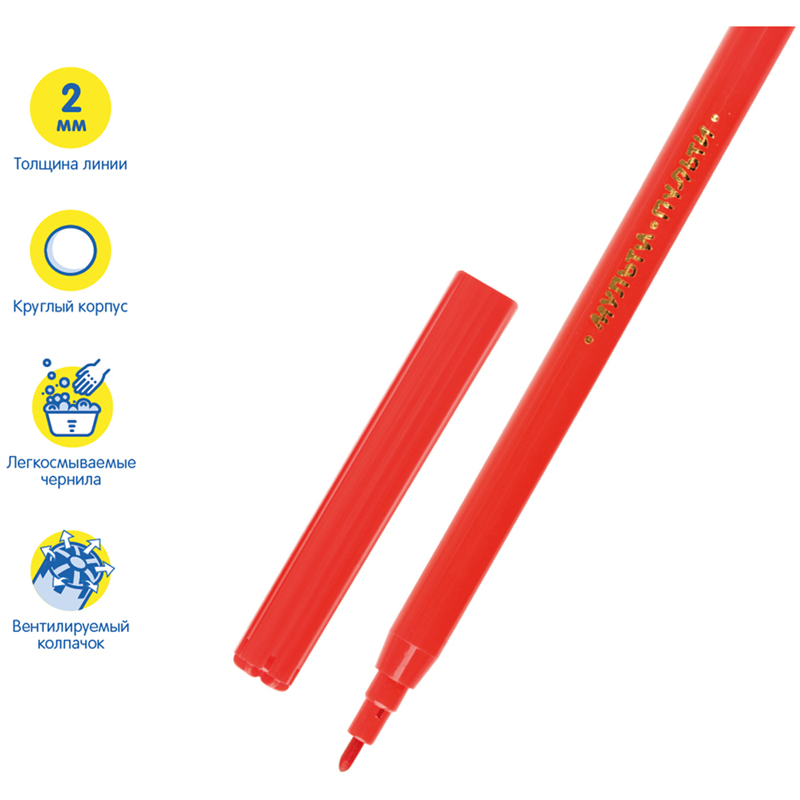 Фломастеры Мульти-Пульти серии «Чебурашка-2» изготовлены с использованием легкосмываемых нетоксичных чернил. В набор входят 12 фломастеров с яркими цветами чернил. Длина линии не менее 500 м. Колпачок фломастера вентилируемый, что поможет избежать негативных сценариев при проглатывании его ребенком. Корпус изготовлен из безопасного полипропилена. Упаковка с любимым героем – Чебурашкой – делает набор ярким и необычным. Коробка имеет европодвес. Для детей старше 3-х лет. Продукция изготовлена в России на современной автоматической линии. • Количество цветов: 12 • Тип наконечника: конический