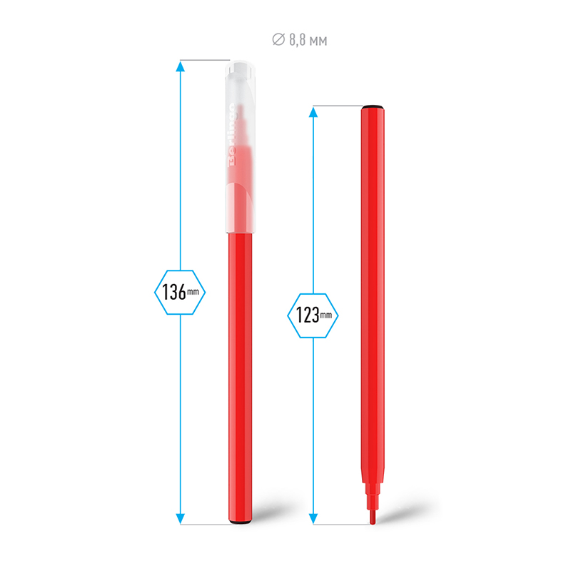Легкосмываемые чернила, вентилируемый колпачок, нетоксичны, корпус изготовлен из полипропилена. Упакованы в блистер с петлей-европодвесом. Длина линии не менее 500 м