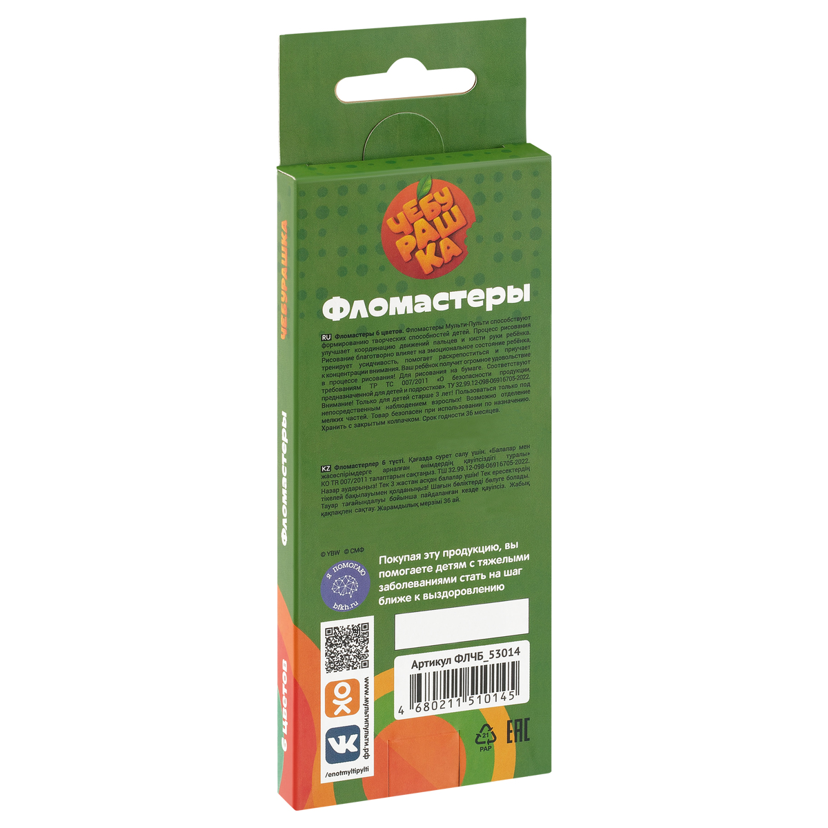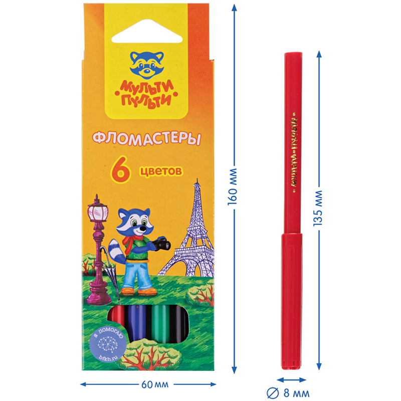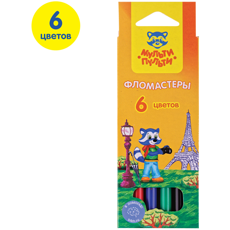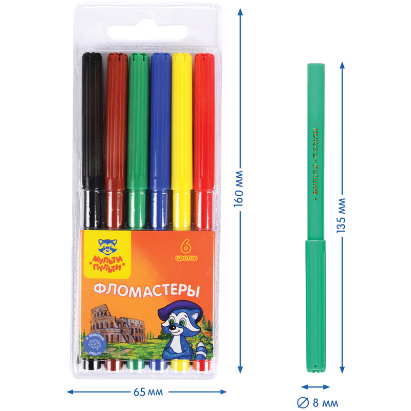 Фломастеры Мульти-Пульти серии "Чебурашка" изготовлены с использованием легкосмываемых нетоксичных чернил. Колпачок фломастера вентилируемый, что поможет избежать негативных сценариев при проглатывании его ребенком. Корпус изготовлен из безопасного полипропилена. Упаковка с любимым героем - Чебурашкой делает набор ярким и необычным. Коробка имеет европодвес. В набор входят 6 фломастеров с яркими цветами чернил. Длина линии не менее 500 м. Для детей старше 3-х лет. Продукция изготовлена в России на современной автоматической линии.