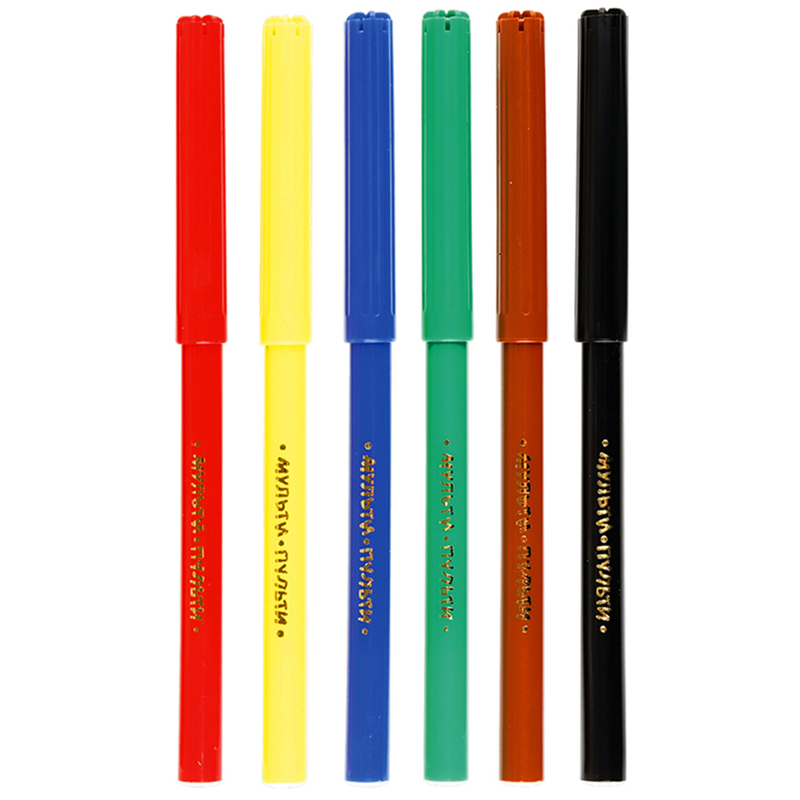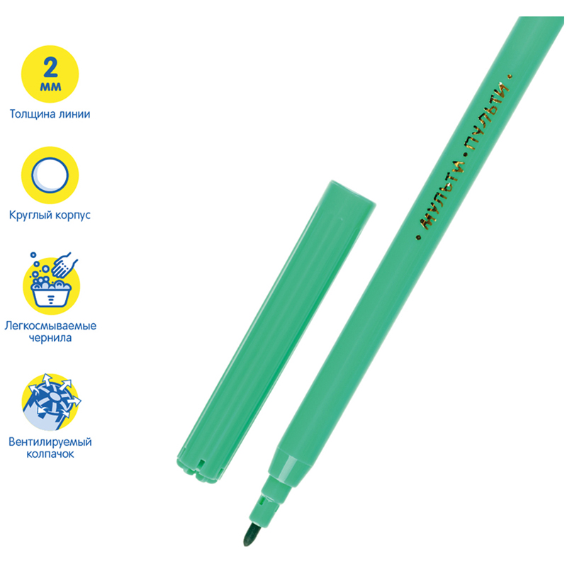 Фломастеры ГАММА серии "Мультики" созданы для комфортного рисования. Тип наконечника – конический. Толщина линии письма до 2,6 мм. В наборе 6 цветов: жёлтый, коричневый, зелёный, красный, синий, чёрный. Они имеют устойчивый к продавливанию наконечник, который не проваливается внутрь корпуса даже при сильном нажатии. Вентилируемый колпачок обеспечивает безопасность ребенка в творческом процессе - при случайном проглатывании не препятствует дыханию. При этом наконечник фломастера изолирован и чернила не высыхают. Чернила на водной основе с пищевыми красителями легко смываются с кожи и одежды. Упакованы в картонную коробку. • Количество цветов: 6; • Тип наконечника: конический.