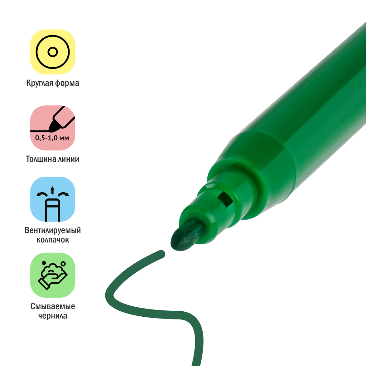 Легкосмываемые чернила, вентилируемый колпачок, нетоксичны, корпус изготовлен из полипропилена. Упакованы в картонную лакированную коробку с петлей-европодвесом. Длина линии не менее 500 м. Для детей старше 3-х лет.