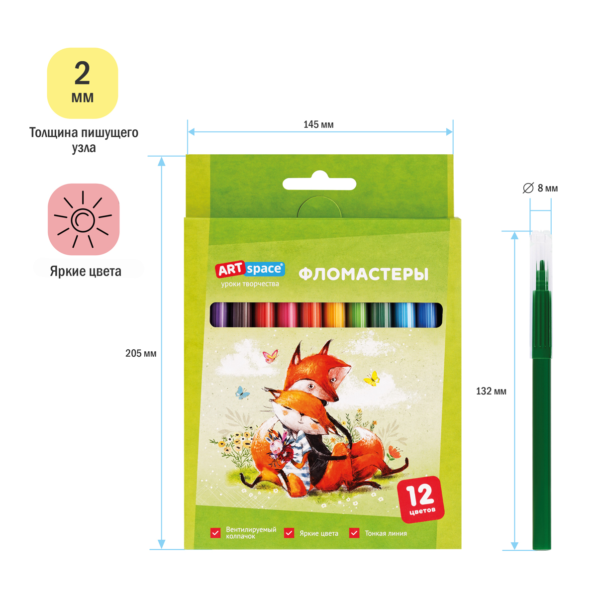 Набор фломастеров. 12 ярких цветов. Вентилируемый колпачок, смываемые чернила на водной основе. Упакованы в картонную коробку с подвесом.