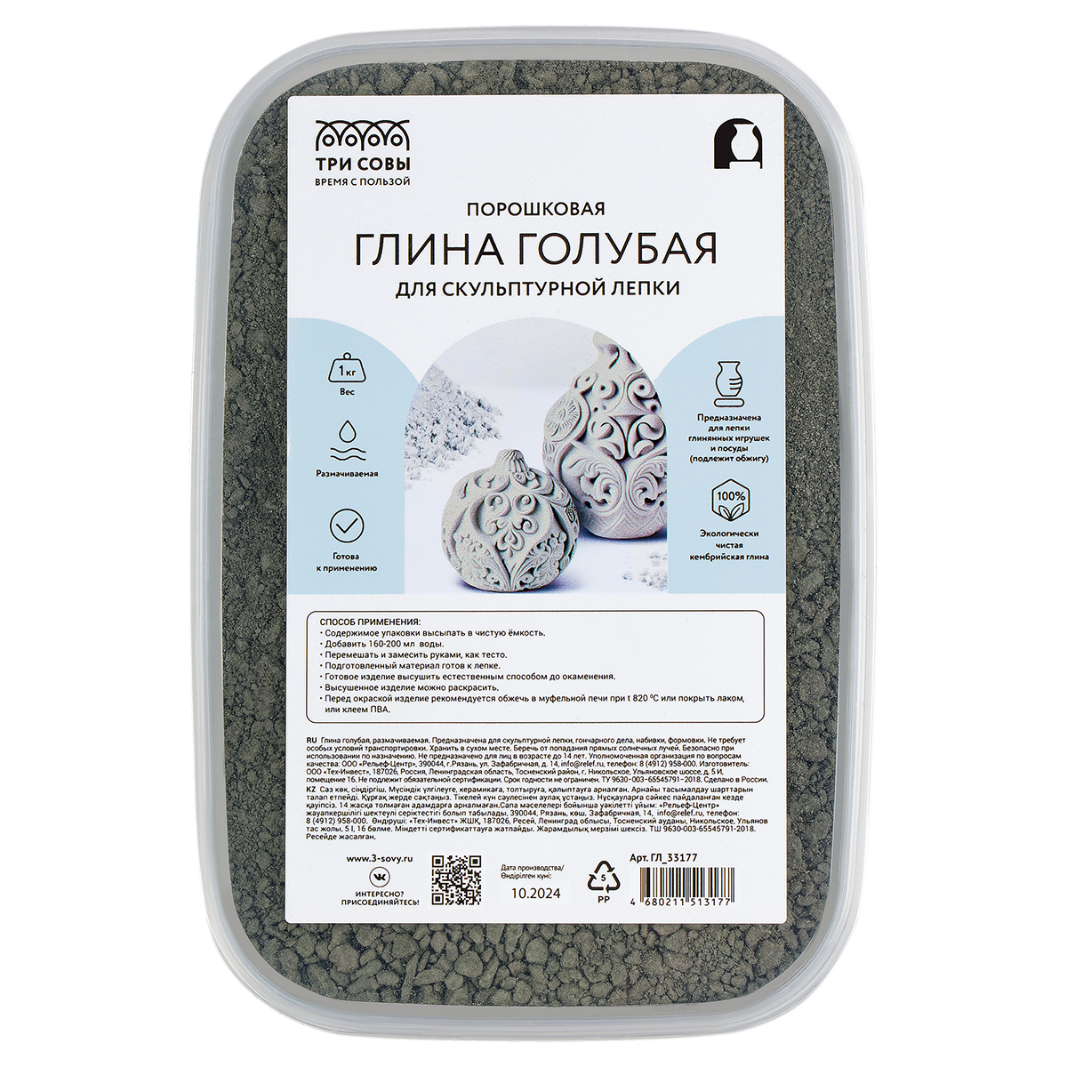 Экологически чистая кембрийская порошковая глина Чкаловского месторождения Ленинградской области при смешивании с водой образует пластичную массу, что позволяет использовать ее для скульптурной и художественной лепки. Не содержит химических добавок, не вызывает аллергической реакции. Занятия лепкой - популярный и любимый многими вид творчества, благотворно влияющий на эмоциональное состояние как взрослого, так и ребёнка. Тренирует усидчивость, прививает умение концентрировать внимание. Также способствует развитию мелкой моторики, стимулирует воображение, образное мышление и творческие способности. Самозатвердевающая глина ТРИ СОВЫ – это идеальное решение для занятий лепкой в художественных студиях, работы на гончарном круге, изготовления глиняной игрушки, изделий художественного промысла, изготовления посуды и других керамических изделий. Также прекрасно подходит для занятий творчеством в домашних условиях. Глина затвердевает на воздухе, но готовое изделие рекомендуется обжечь в муфельной печи для