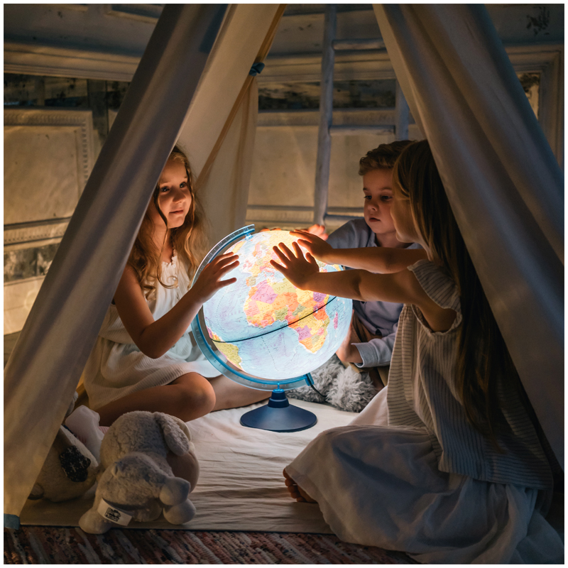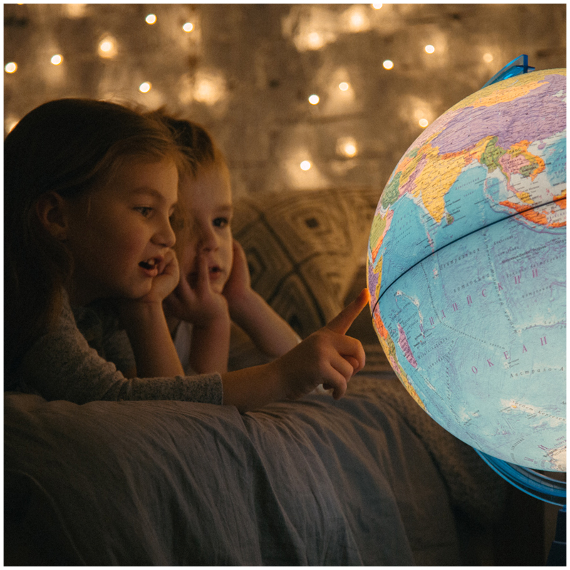 Глобус включает в себя две карты: красочная лоскутная карта мира расскажет ребенку о странах мира и их столицах, а при включенной подсветке на глобусе проступает карта звездного неба. Можно наслаждаться красотой ночного неба, не выходя из дома! Глобус поможет ребёнку в изучении окружающего мира, географии, астрономии и экономики. Мягкая подсветка глобуса оказывает приятный медитативный эффект и помогает настроиться на отдых. Отличный выбор для загруженного домашними заданиями школьника.
