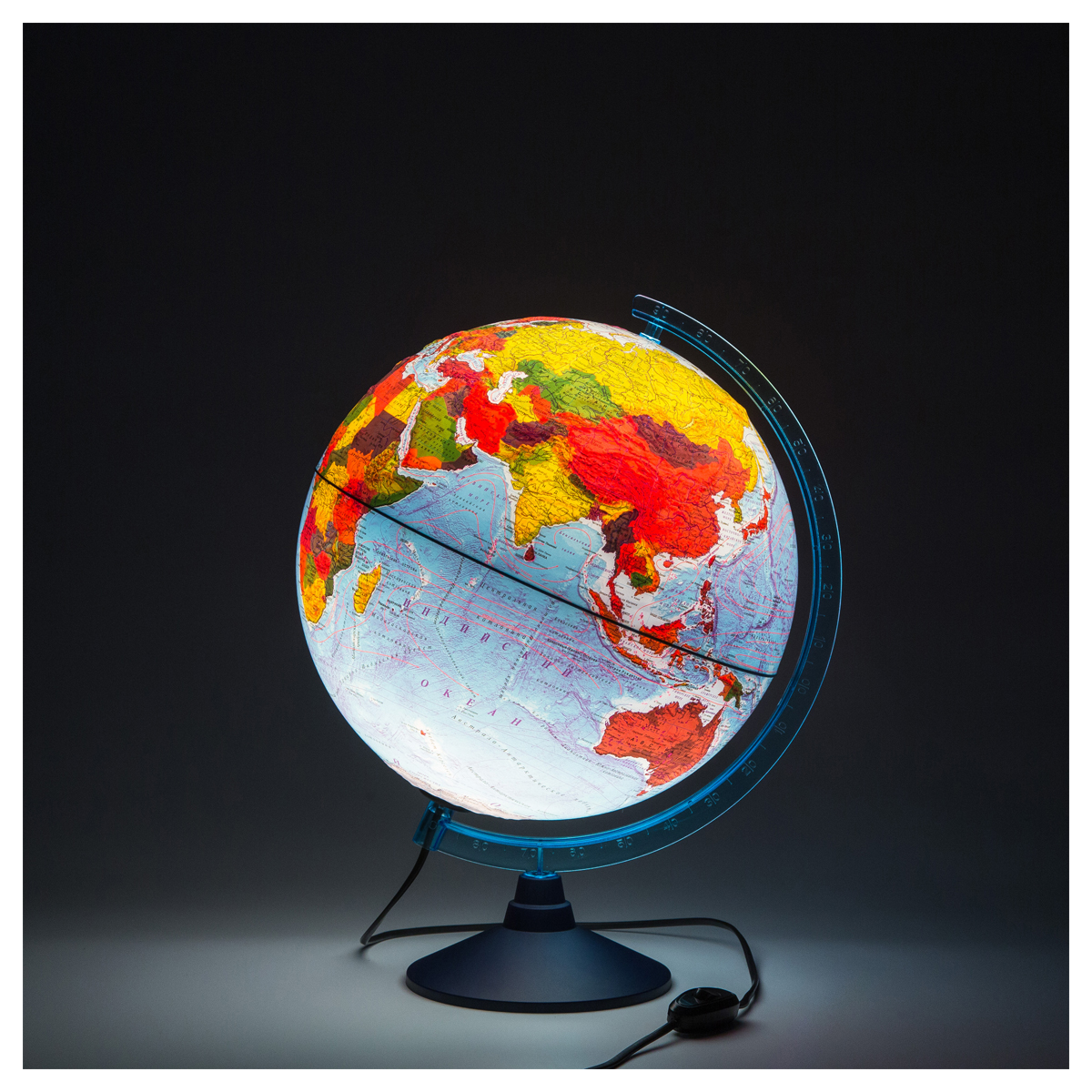 Глобус с политической картой станет верным помощником в изучении географии, истории, экономики. Яркое лоскутное полотно политической карты даёт наглядное представление о современном политическом устройстве мира. Компактный размер глобуса 21 см удобен для размещения на рабочем столе. Карта глобуса максимально подробная, все надписи легко читаются. Глобус имеет подсветку от сети, что позволяет комфортно использовать его в темное время суток. Лампочку внутри сферы при необходимости легко заменить. Глобус выполнен из прочного высококачественного пластика с соблюдением всех современных технологий. Упакован в фирменную подарочную коробку.