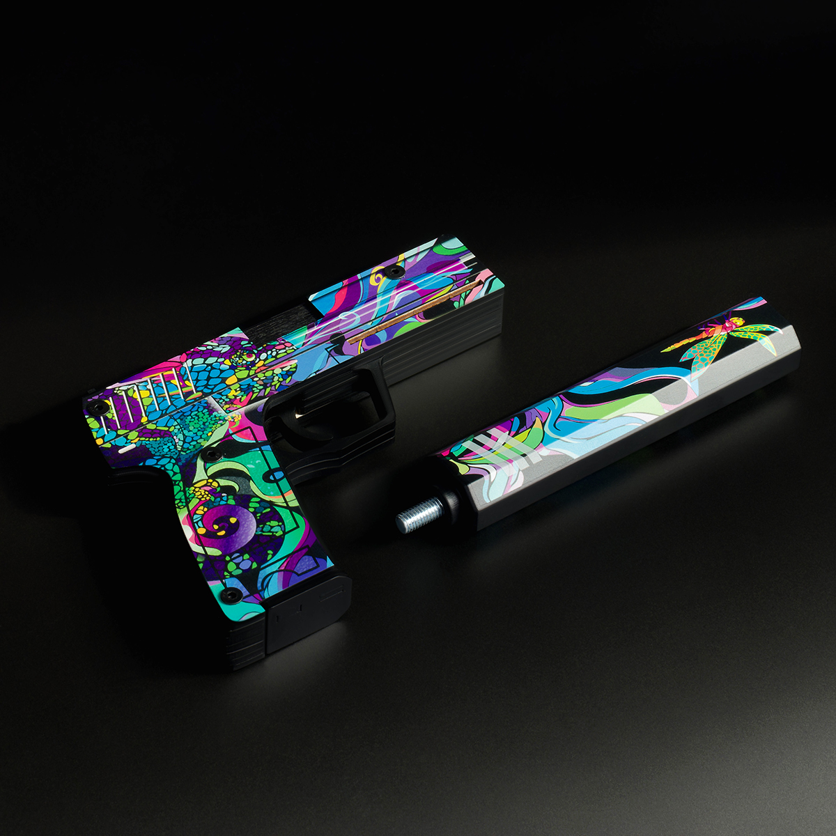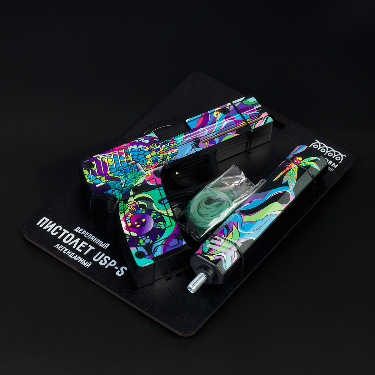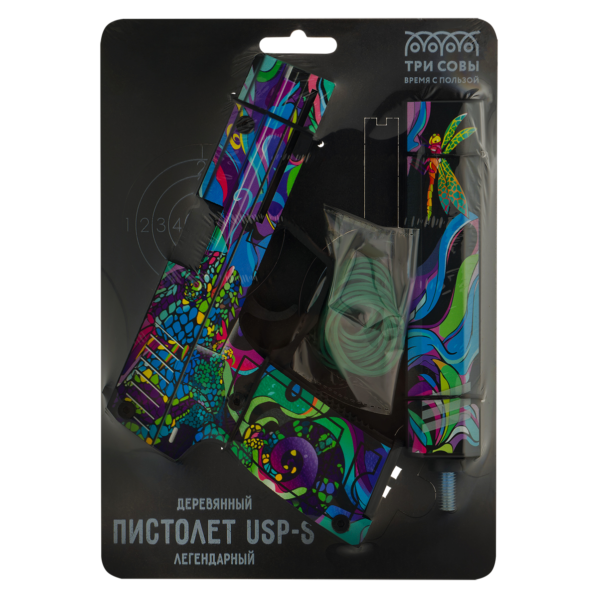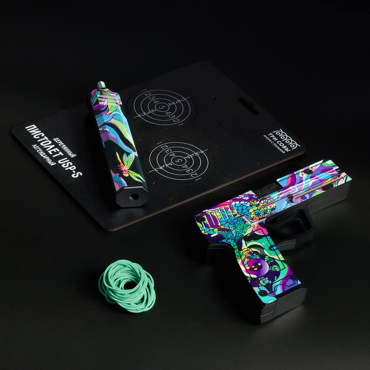 Деревянный пистолет USP-S бренда «ТРИ СОВЫ» порадует высоким качеством, ярким исполнением и безопасностью. Пистолет-резинкострел «Хамелеон» – настоящее игровое оружие. Он заряжается резинками до 8 штук с дальностью стрельбы до 10 метров. Хранить резинки можно в магазине. Съёмный глушитель позволит сделать игрушечное оружие более компактным для транспортировки в сумке. Пистолет абсолютно безопасен для детей и походит для активных игр, как дома, так и на улице. В наборе идут деревянные мишени, которые извлекаются из подложки пистолета. Деревянное оружие, окрашенное с помощью стойкого и яркого пигмента, выглядит настоящим произведением искусства, а его поверхность имеет неповторимый рисунок. Важно помнить, что, сделанный из дерева, пистолет требует аккуратного обращения. Не стоит подвергать изделие чрезмерным механическим нагрузкам. Серия «Легендарный» отличает игрушку реалистичностью и четкой детализацией, а также специальный слой матового лака защищает от нежелательных механических повреждений. «ТРИ С