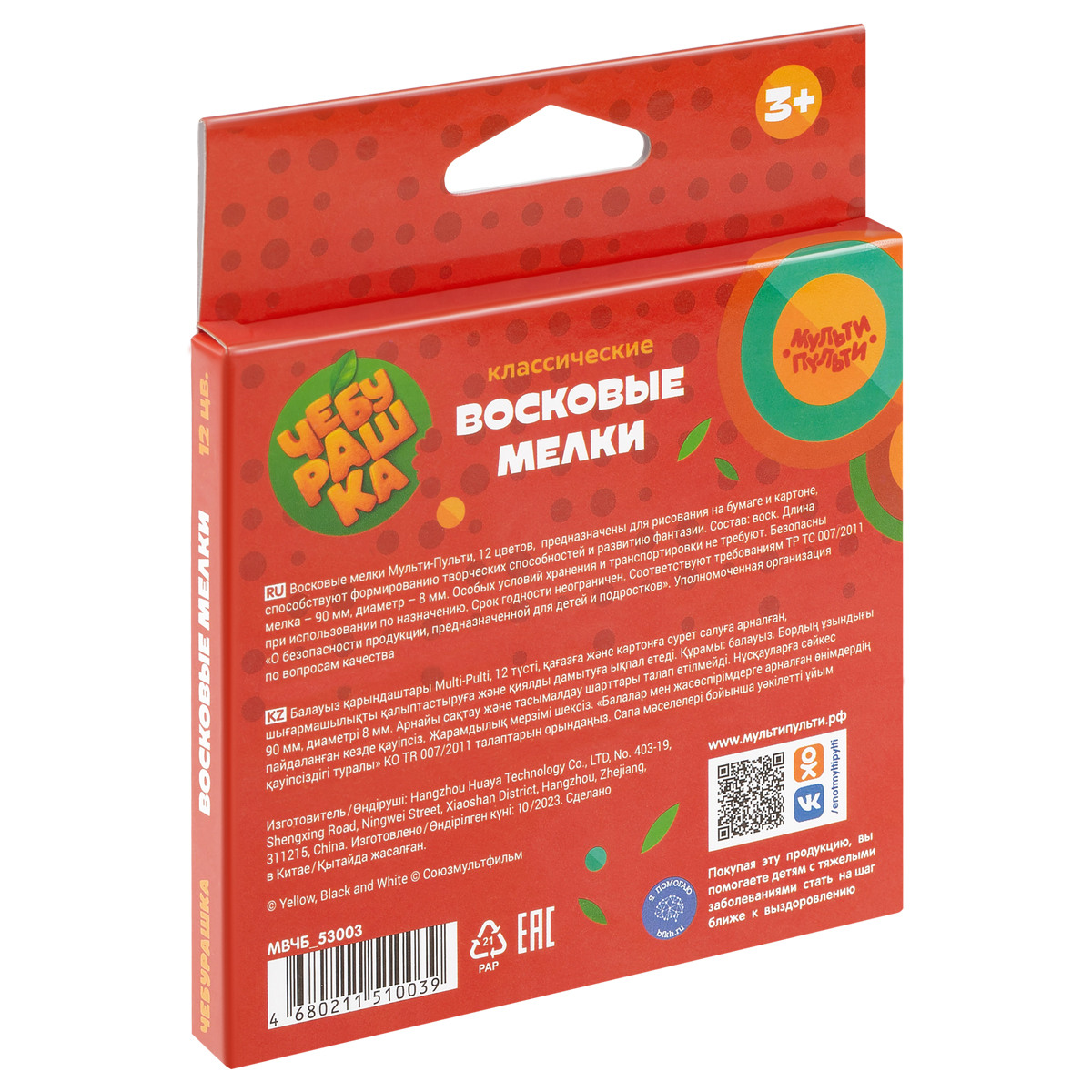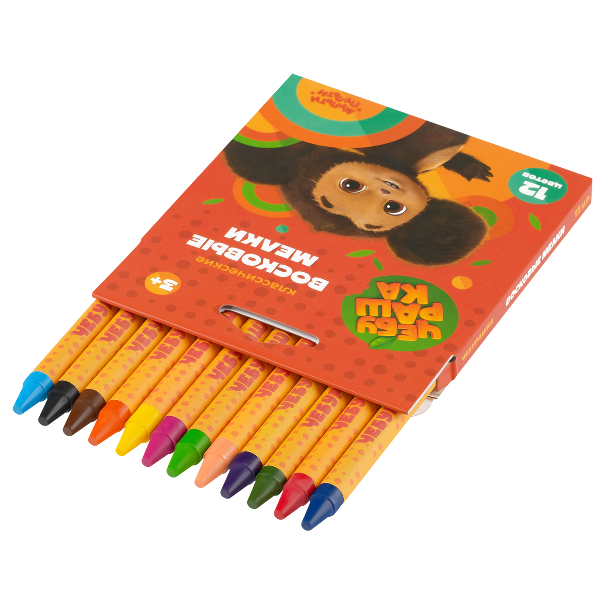 Набор из 12 восковых мелков «Мульти-Пульти» серии «Чебурашка» отлично подходит для рисования и воплощения смелых творческих идей. В наборе 12 ярких цветов: жёлтый, зелёный, синий, красный, чёрный, коричневый, оранжевый, светло-коричневый, голубой, светло-зелёный, тёмно-синий, фиолетовый. Мелки имеют круглую форму, длина мелка составляет 90 мм, а диаметр корпуса — 8 мм. Они легко наносятся на бумагу, картон, дерево, керамику. Особых условий хранения и транспортировки не требуют. Подходят для детей старше 3-х лет. Каждый мелок представлен в бумажной обёртке. Набор упакован в картонную коробку с европодвесом. • Количество цветов: 12; • Количество штук: 12; • Форма: круглая; • Длина: 90 мм; • Диаметр: 8 мм