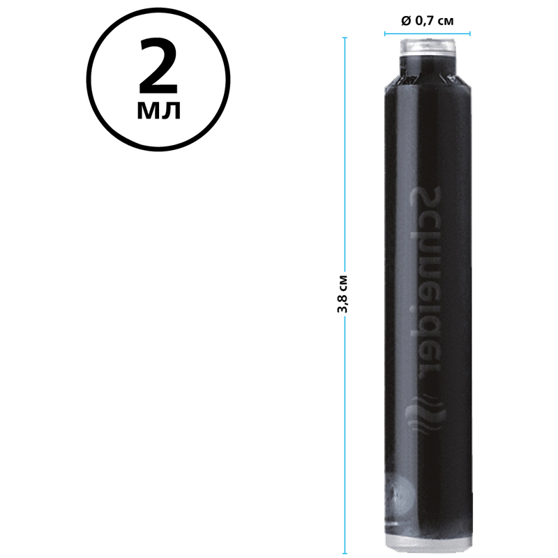 Письменные принадлежности Schneider разрабатываются и производятся только в Германии, их отличают функциональный дизайн, безупречное качество, надежность и экологичность. Чернильный картридж подходит для перьевых ручек Schneider и большинства других производителей. Объем чернил 2 мл. Длина картриджа - 3,8 см, диаметр 0,7 см. Длина письма до 450 метров. Сделано в Германии!
