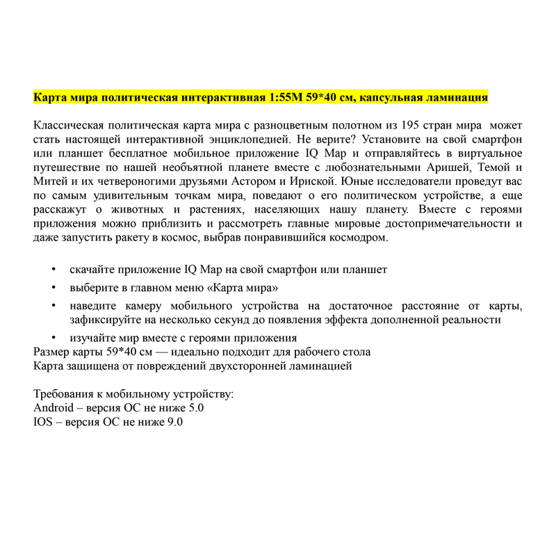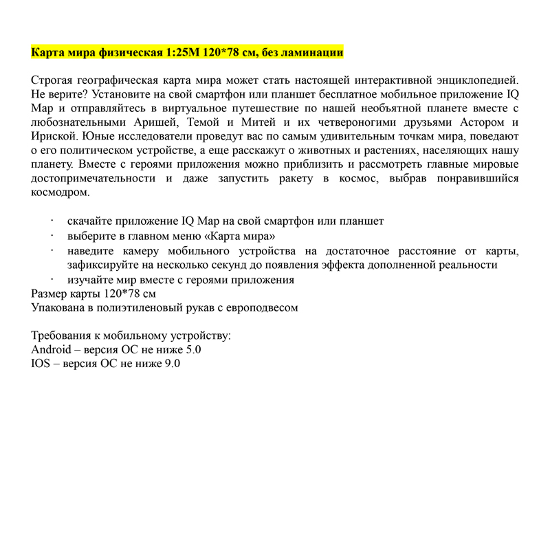 Политическая карта Мира Globen благодаря AR-технологиям превратилась в современное учебное пособие с элементами дополненной реальности. Достаточно просто скачать бесплатное приложение IQ Map на смартфон или планшет, чтобы простая карта превратилась в "живую". Навести камеру смартфона на карту, подождать несколько секунд до появления эффекта AR-технологий. Такая карта, использующая AR-технологии, поможет ребенку намного быстрее и лучше усвоить новую информацию, научит ориентироваться на карте, привьет интерес к новым знаниям. Без использования приложения карта Мира является серьезным учебным пособием. Выполнена с точным соблюдением масштаба, принятых условных географических обозначений. Таблица условных обозначений вынесена в отдельный список. Классическое многоцветное изображения политической карты. Отмечены границы государств, столицы, крупные города, порты и т.д. Кроме этого отображены географические объекты, такие как реки, озера, моря и т.п. Надписи на русском языке хорошо читаются. В отдельном поле разме