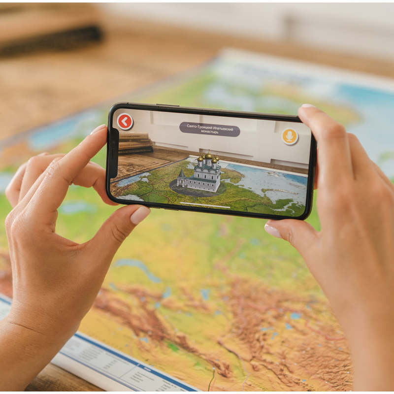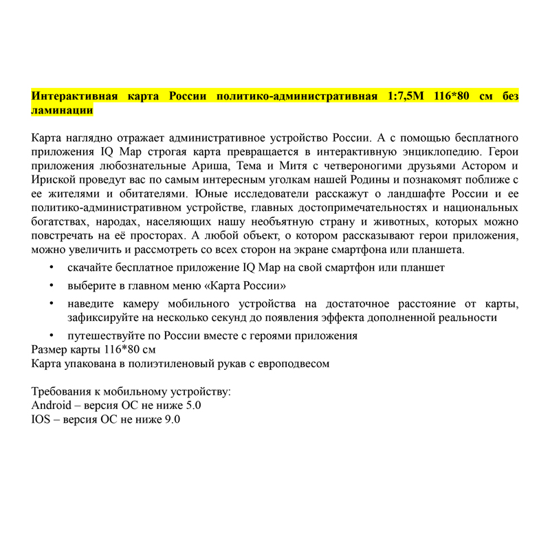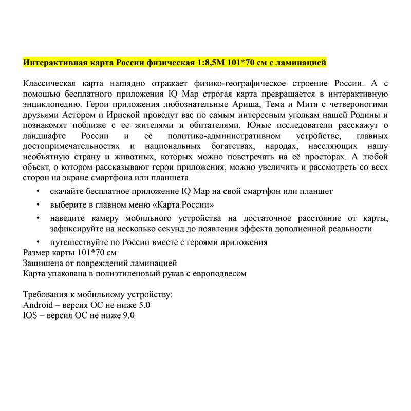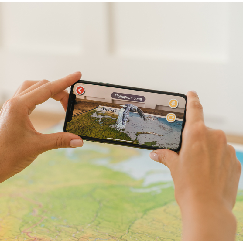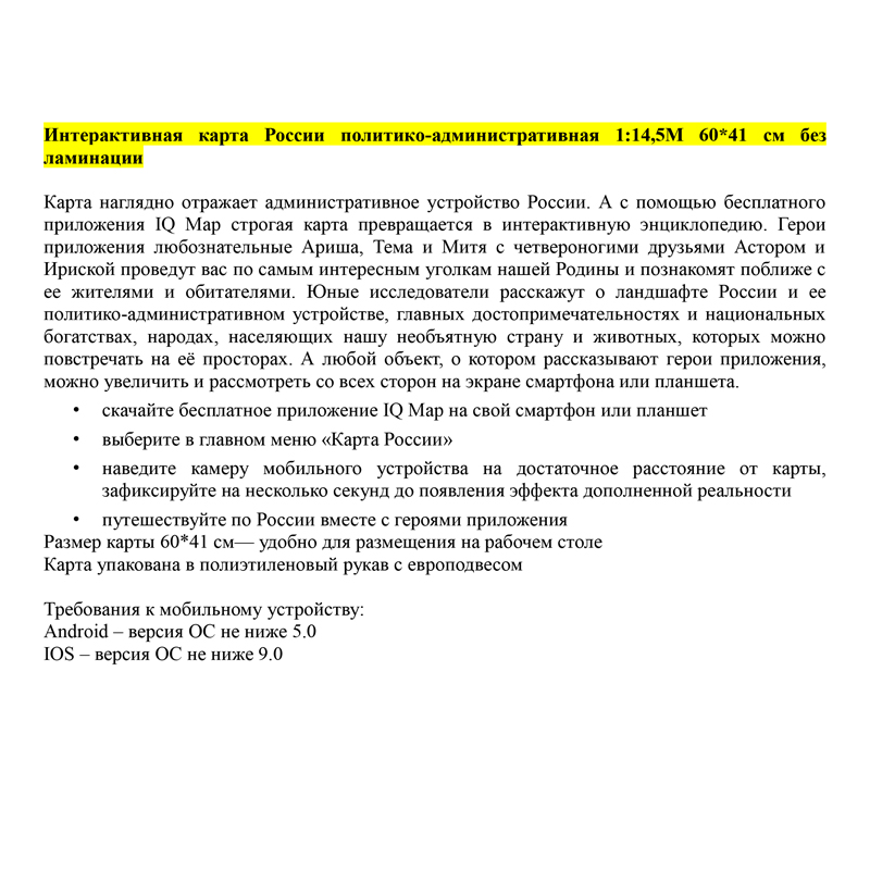 Интерактивная физическая карта Российской Федерации Globen - новое современное учебное пособие с элементами дополненной реальности для изучения географии и окружающего мира. Достаточно просто скачать бесплатное приложение IQ Map на смартфон или планшет, чтобы простая карта превратилась в "живую". Навести камеру смартфона на карту, подождать несколько секунд до появления эффекта AR-технологий. Такая карта, использующая AR-технологии, поможет ребенку намного быстрее и лучше усвоить новую информацию, научит ориентироваться на карте, привьет интерес к новым знаниям. Без использования приложения карта Мира является серьезным учебным пособием. Выполнена с точным соблюдением масштаба, принятых условных картографических обозначений. Таблица условных обозначений вынесена в отдельный список. Классическая цветовая гамма изображения общегеографической карты. Кроме географических объектов на карте отмечены города, границы областей и республик, сеть дорог. В нижней части карты расшифровка числовых обозначений и дополнитель