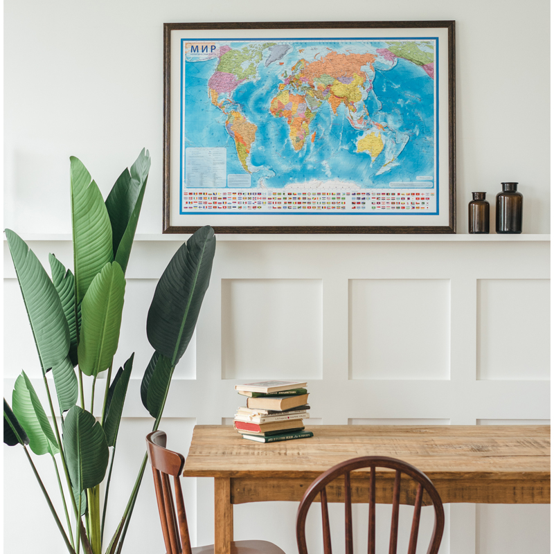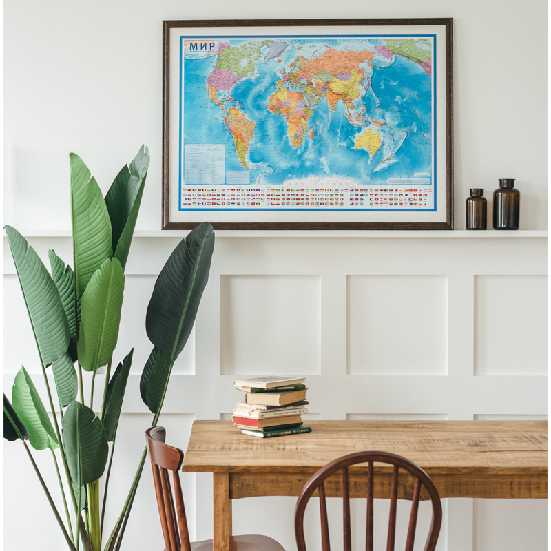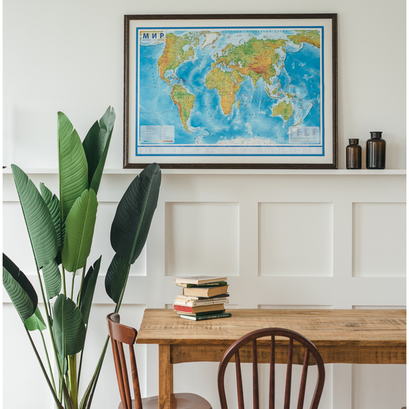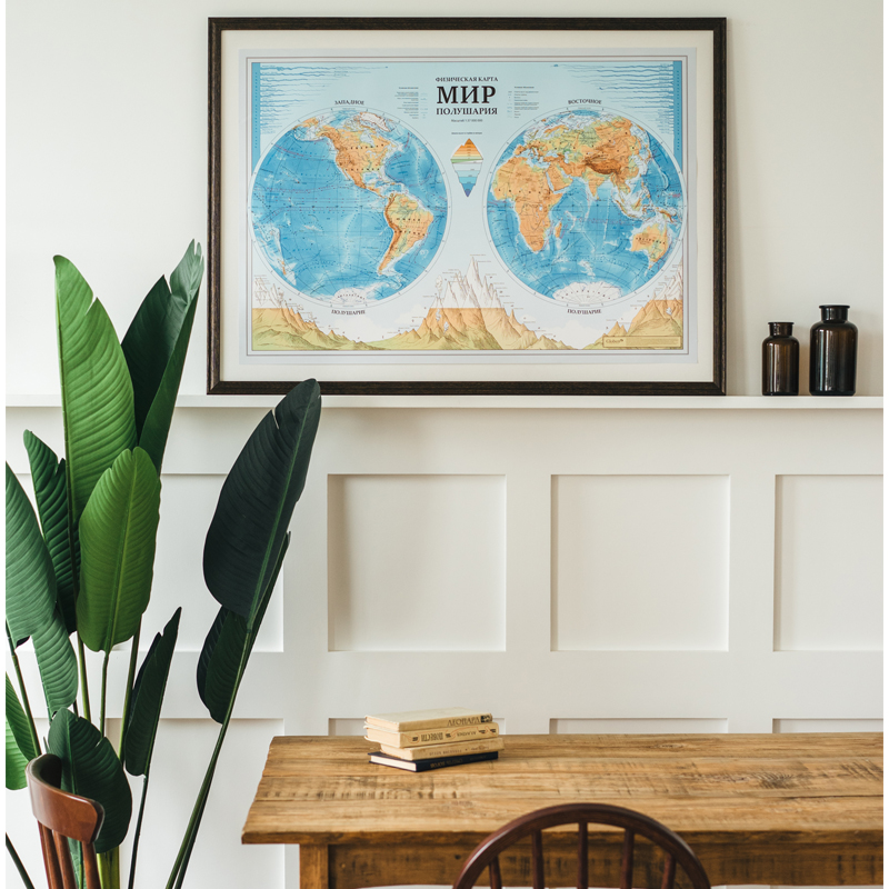 Географическая карта дает комплексное представление о строении мира, расположении материков и океанов, рельефе нашей планеты. Дополнительно карта содержит справочную информацию о высоте гор и длине рек. Выполнена в ретро стиле и станет не только полезным учебным пособием, но и украшением интерьера.