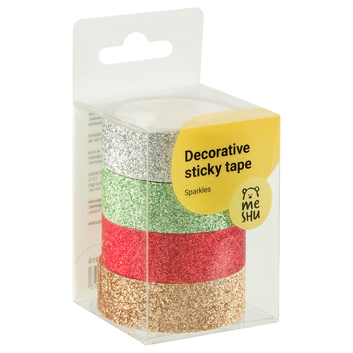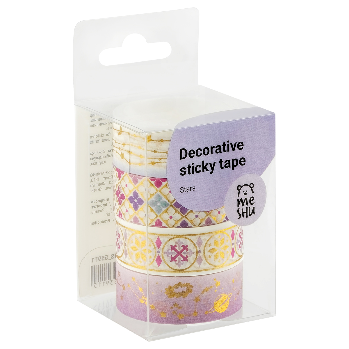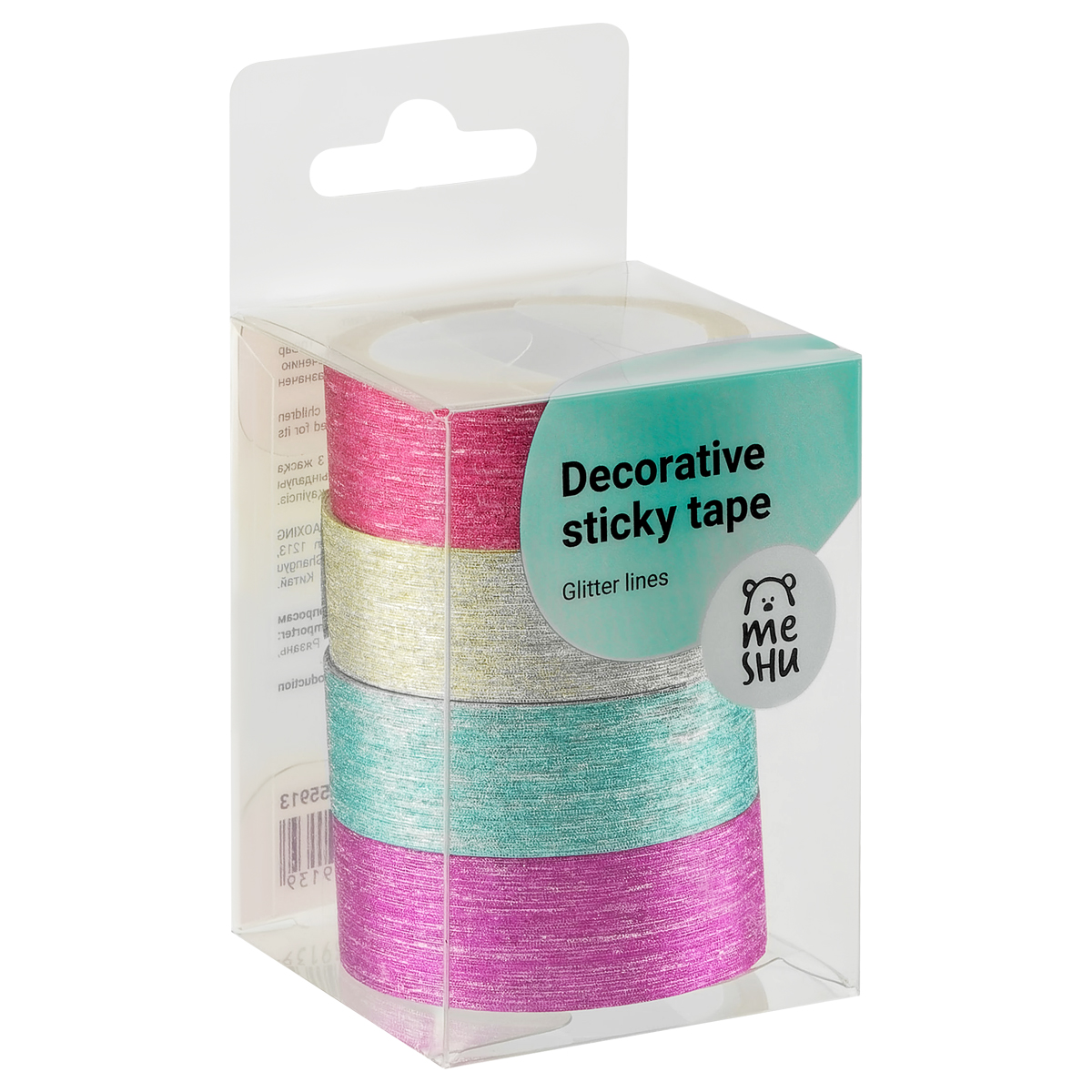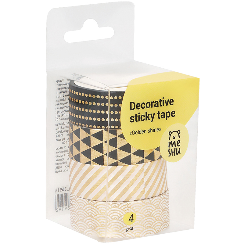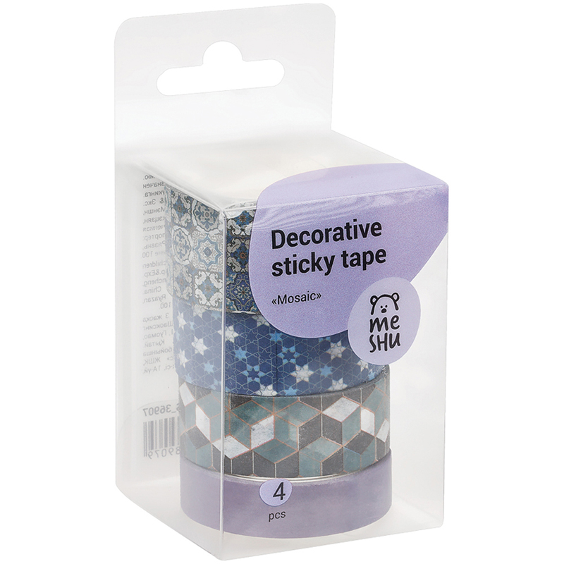 Декоративные клейкие ленты MESHU предназначены для упаковки подарков, оформления поделок, элементов интерьера и скрапбукинга. Открытки, альбомы, ежедневники, подставки, цветочные горшки, подсвечники, рамки и много другое может преобразиться с декоративными лентами MESHU. Яркие и современные дизайны сделают процесс творчества увлекательным, а результат впечатляющим. А качественная клеевая основа позволит надёжно зафиксировать ленту и быть уверенным в долговечности декора. • Ширина ленты: 15 мм; • Длина намотки: 3000 мм; • Материал: бумага; • Количество в наборе: 4.