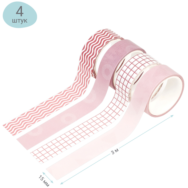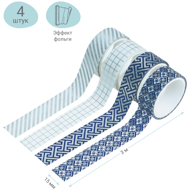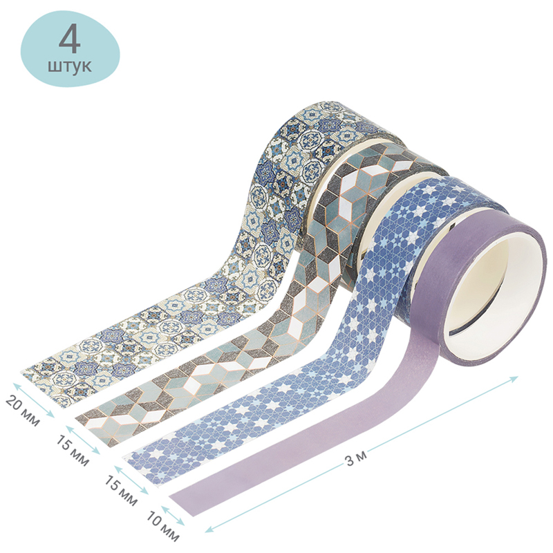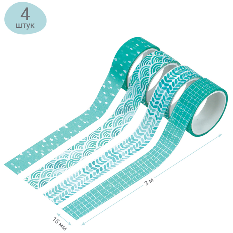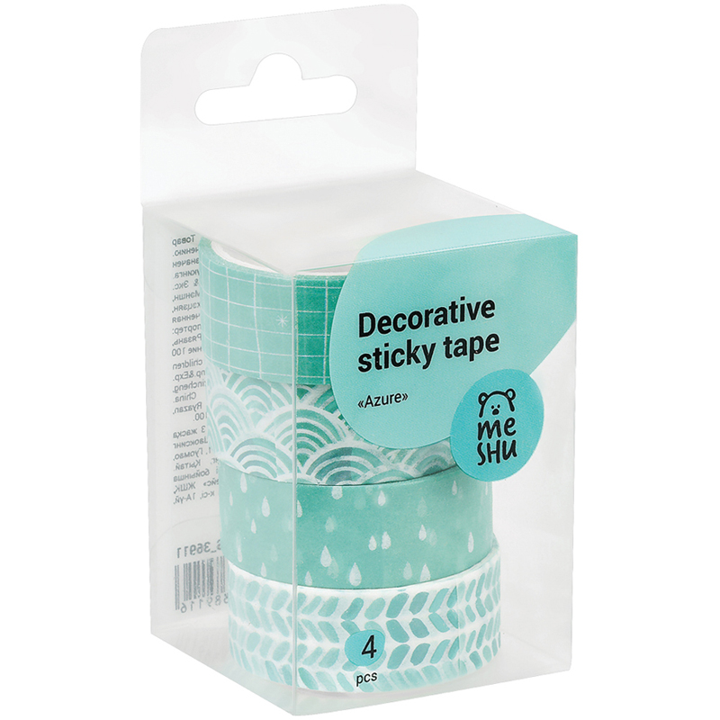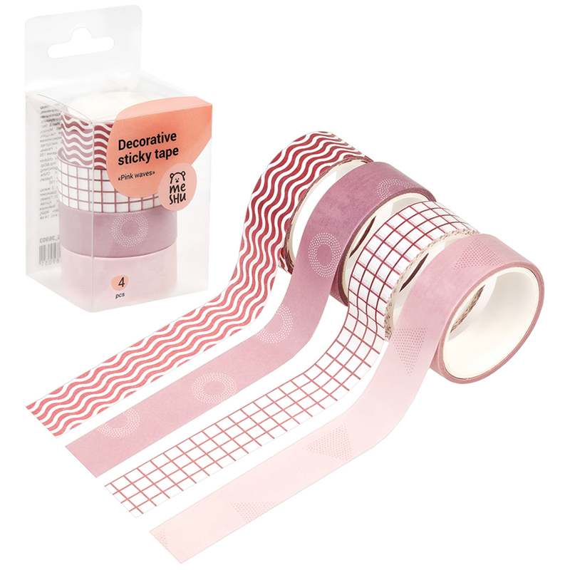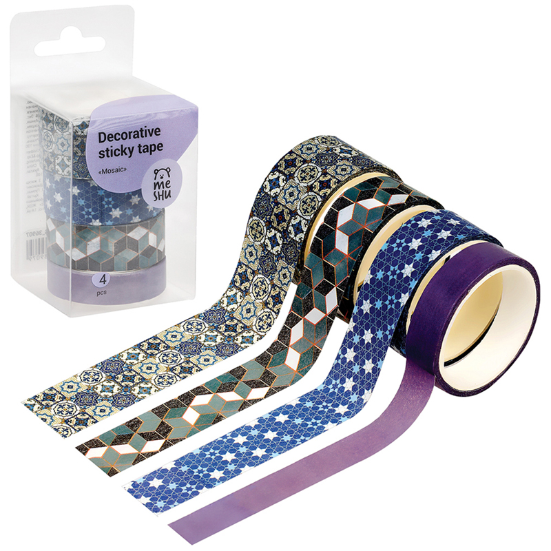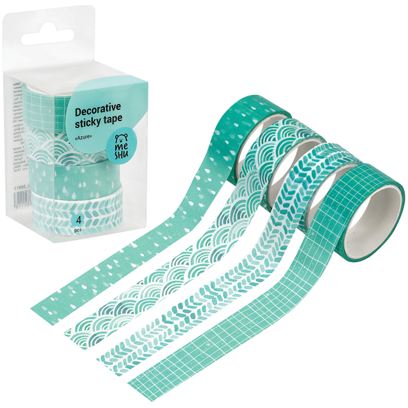 Декоративные клейкие ленты MESHU предназначены для упаковки подарков, оформления поделок, элементов интерьера и скрапбукинга. Открытки, альбомы, ежедневники, подставки, цветочные горшки, подсвечники, рамки и много другое может преобразиться с декоративными лентами MESHU. Яркие и современные дизайны сделают процесс творчества увлекательным, а результат впечатляющим. А качественная клеевая основа позволит надёжно зафиксировать ленту и быть уверенным в долговечности декора. • Ширина ленты: 15мм; • Длина намотки: 3000 мм; • Материал: бумага; • Количество в наборе: 4.