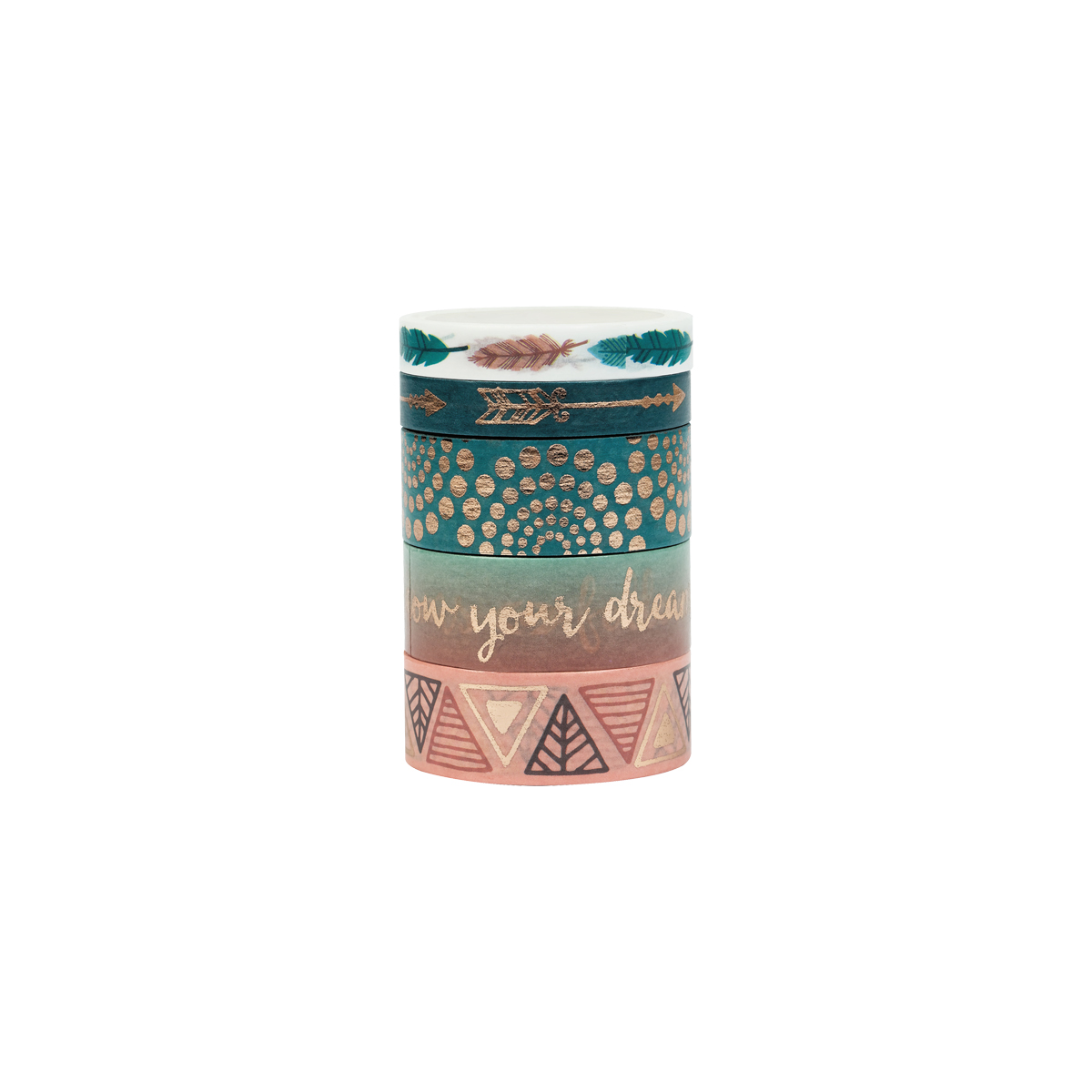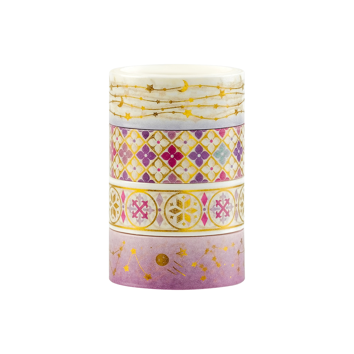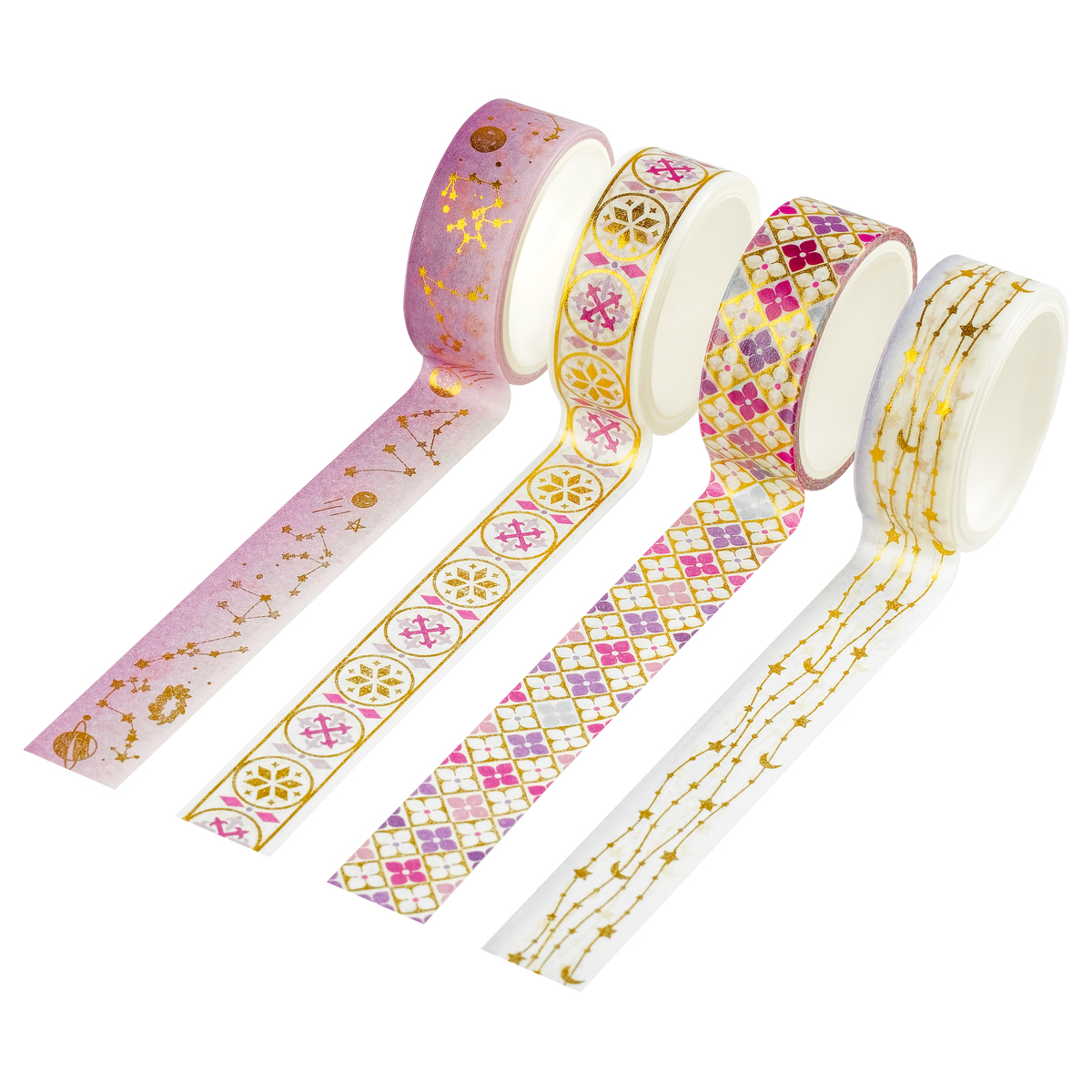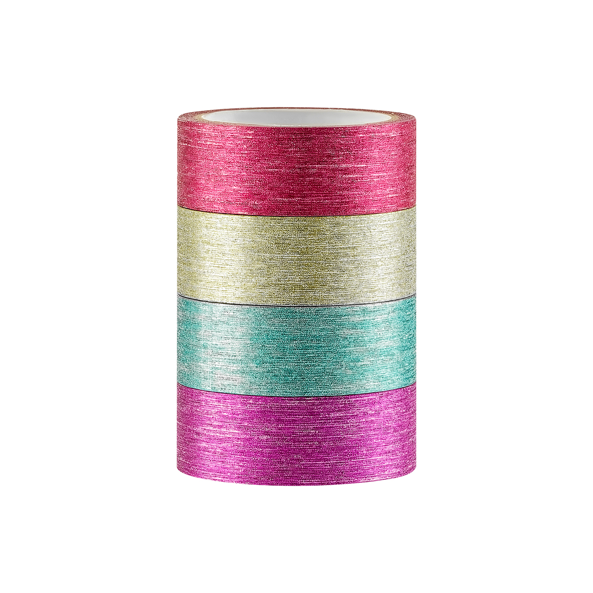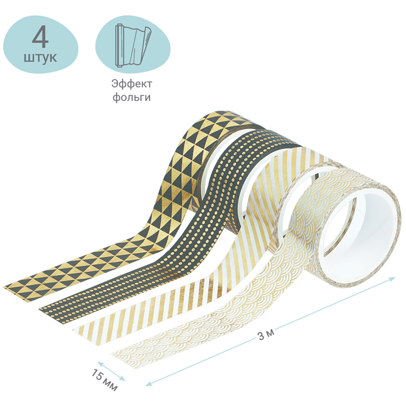 Декоративные клейкие ленты MESHU предназначены для упаковки подарков, оформления поделок, элементов интерьера и скрапбукинга. Открытки, альбомы, ежедневники, подставки, цветочные горшки, подсвечники, рамки и много другое может преобразиться с декоративными лентами MESHU. Яркие и современные дизайны сделают процесс творчества увлекательным, а результат впечатляющим. А качественная клеевая основа позволит надёжно зафиксировать ленту и быть уверенным в долговечности декора. • Ширина ленты: 15мм; • Длина намотки: 3000 мм; • Материал: бумага; • Количество в наборе: 4.
