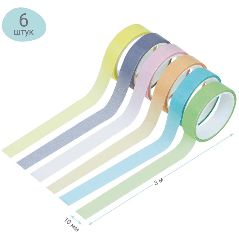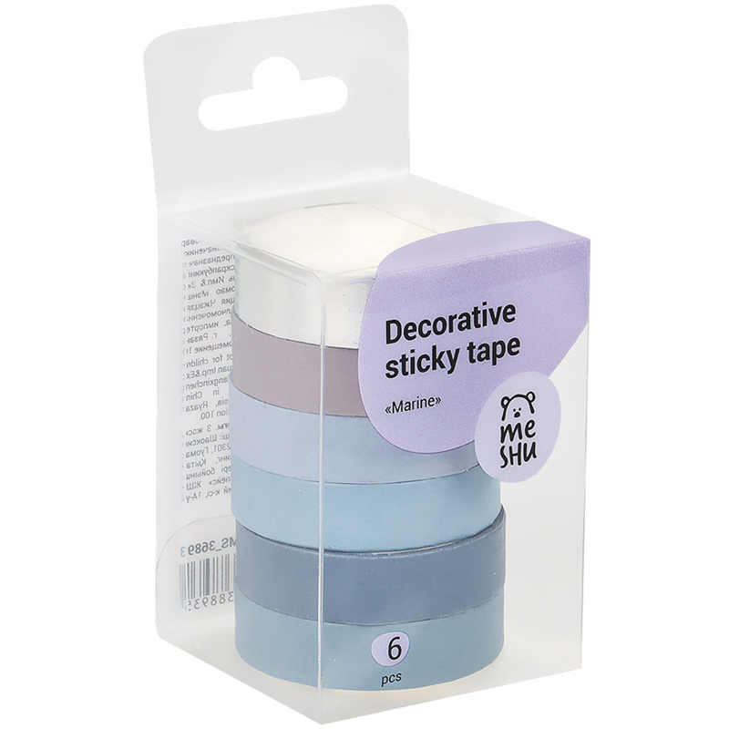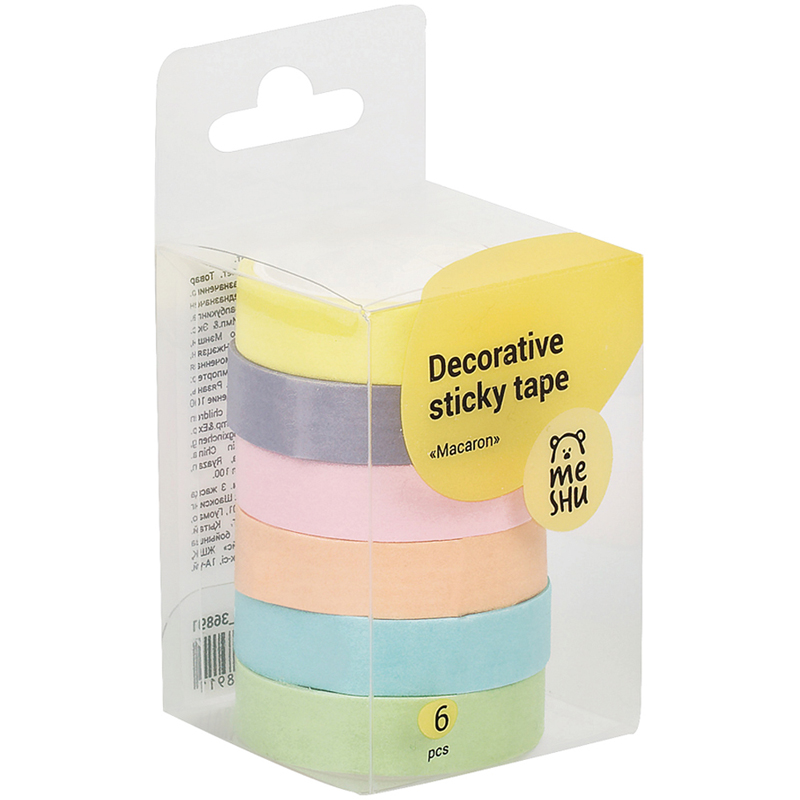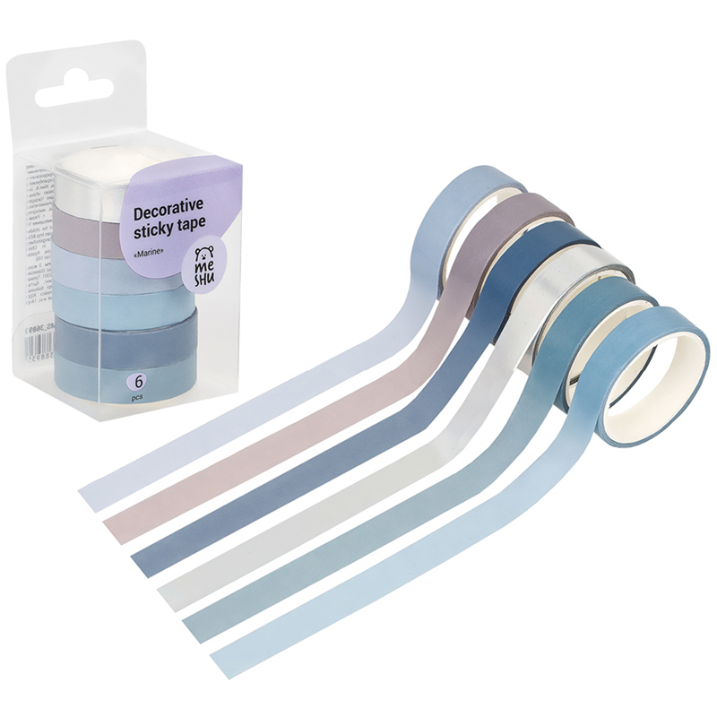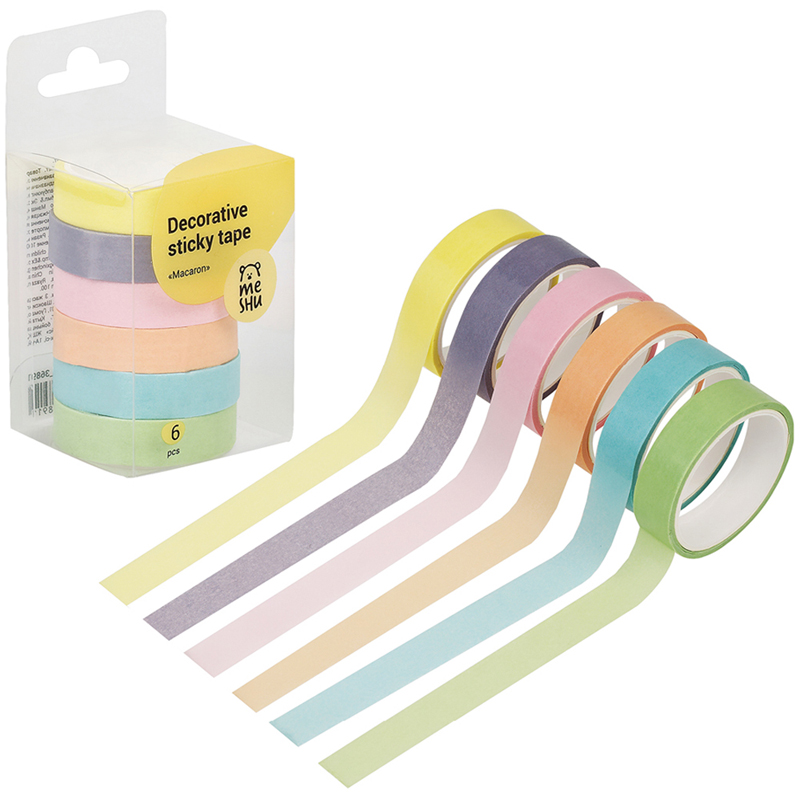 Декоративные клейкие ленты MESHU предназначены для упаковки подарков, оформления поделок, элементов интерьера и скрапбукинга. Открытки, альбомы, ежедневники, подставки, цветочные горшки, подсвечники, рамки и много другое может преобразиться с декоративными лентами MESHU. Яркие и современные дизайны сделают процесс творчества увлекательным, а результат впечатляющим. А качественная клеевая основа позволит надёжно зафиксировать ленту и быть уверенным в долговечности декора. • Ширина ленты: 15 мм; • Длина намотки: 3000 мм; • Материал: бумага; • Количество в наборе: 6.