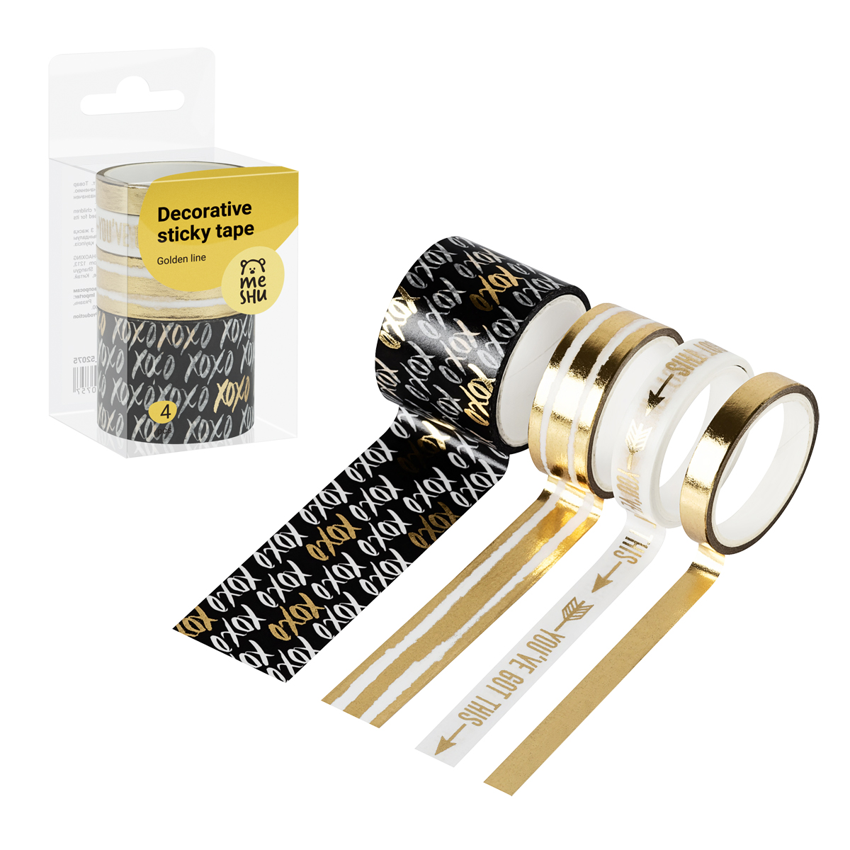 Декоративные клейкие ленты MESHU предназначены для упаковки подарков, оформления поделок, элементов интерьера и скрапбукинга. Открытки, альбомы, ежедневники, подставки, цветочные горшки, подсвечники, рамки и много другое может преобразиться с декоративными лентами MESHU. Яркие и современные дизайны сделают процесс творчества увлекательным, а результат впечатляющим. А качественная клеевая основа позволит надёжно зафиксировать ленту и быть уверенным в долговечности декора. • Ширина ленты: 30 мм, 15мм, 10 мм, 7мм; • Длина намотки: 3000 мм; • Материал: бумага; • Количество в наборе: 4.