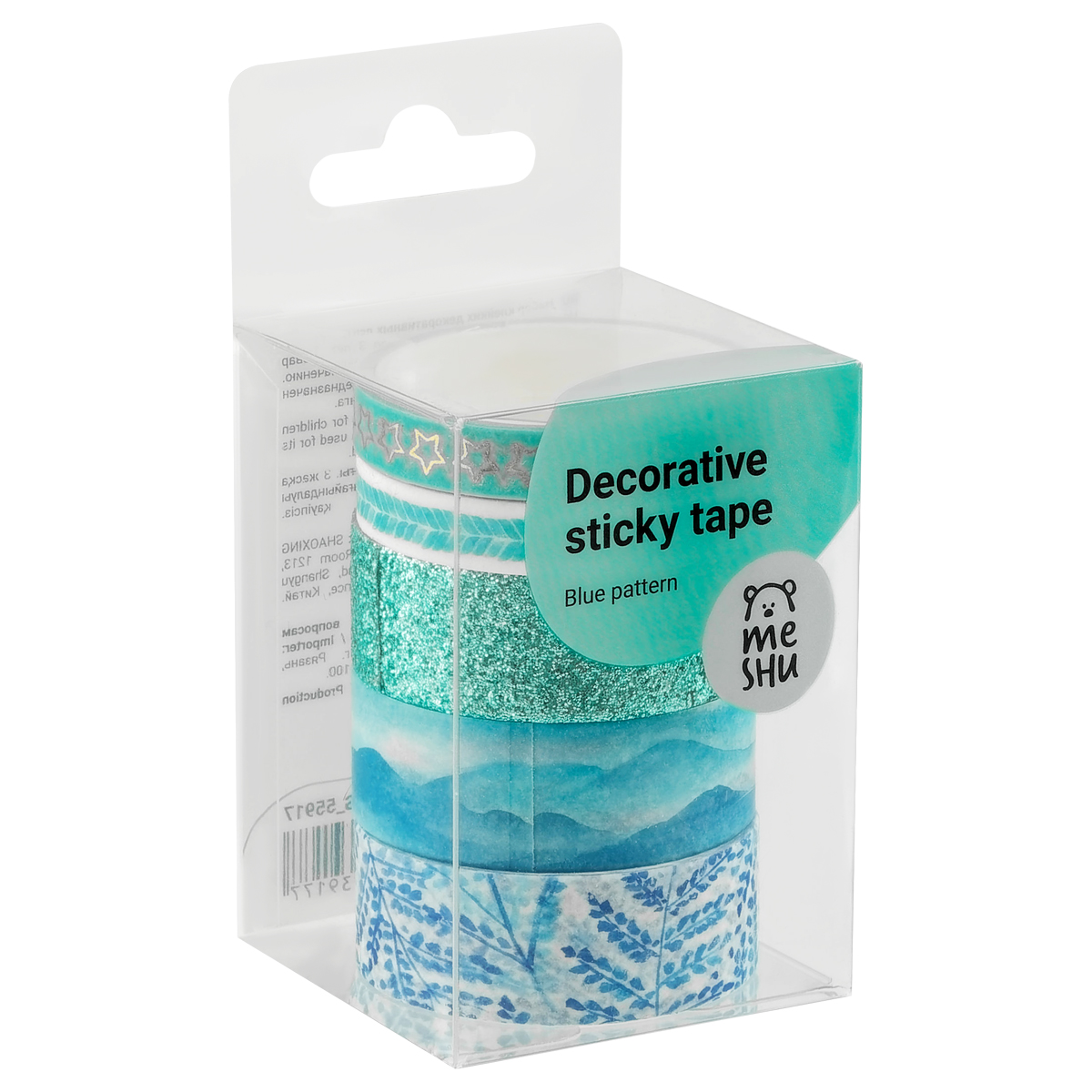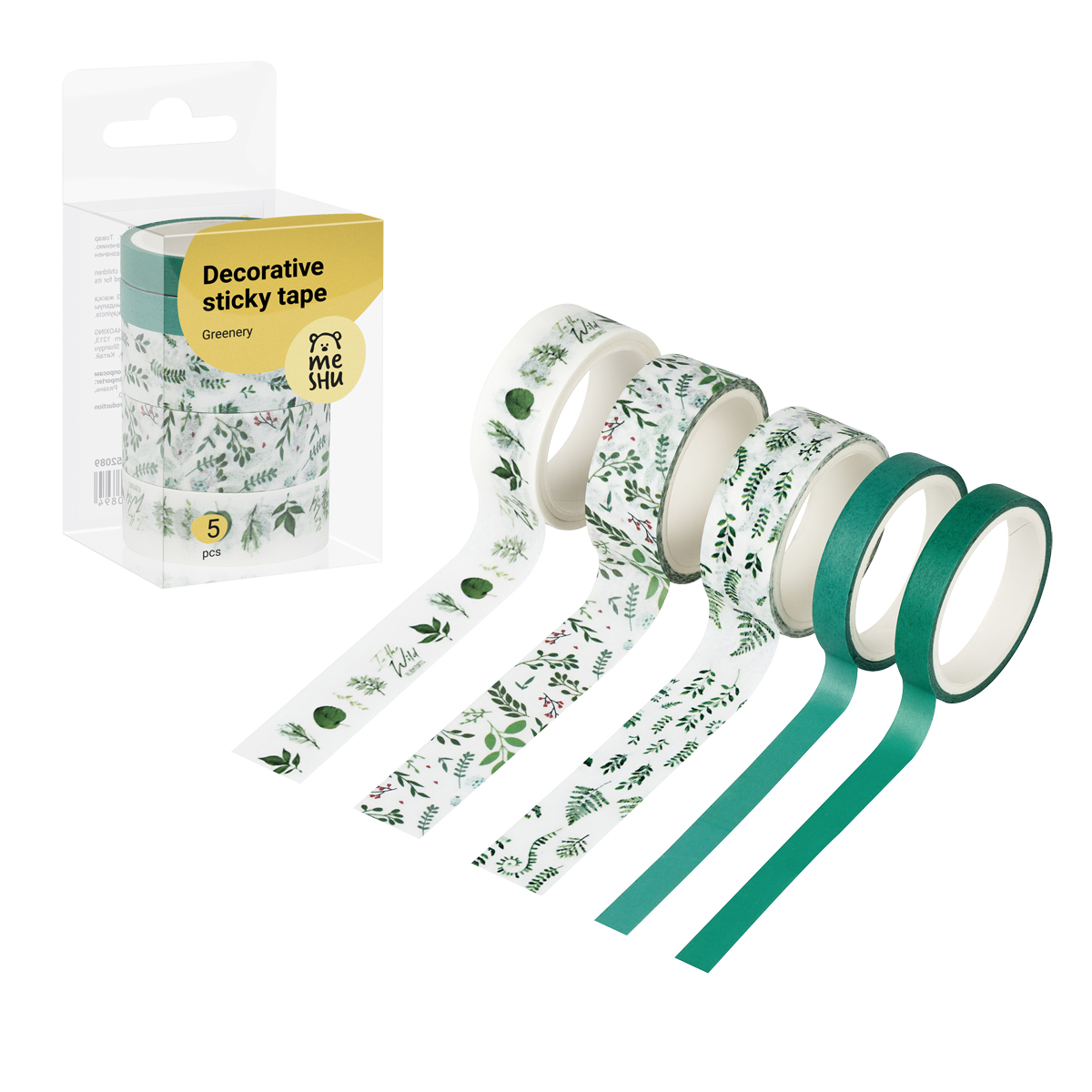 Декоративные клейкие ленты MESHU предназначены для упаковки подарков, оформления поделок, элементов интерьера и скрапбукинга. Открытки, альбомы, ежедневники, подставки, цветочные горшки, подсвечники, рамки и много другое может преобразиться с декоративными лентами MESHU. Яркие и современные дизайны сделают процесс творчества увлекательным, а результат впечатляющим. А качественная клеевая основа позволит надёжно зафиксировать ленту и быть уверенным в долговечности декора. • Ширина ленты: 15мм, 7мм; • Длина намотки: 3000 мм; • Материал: бумага; • Количество в наборе: 5.