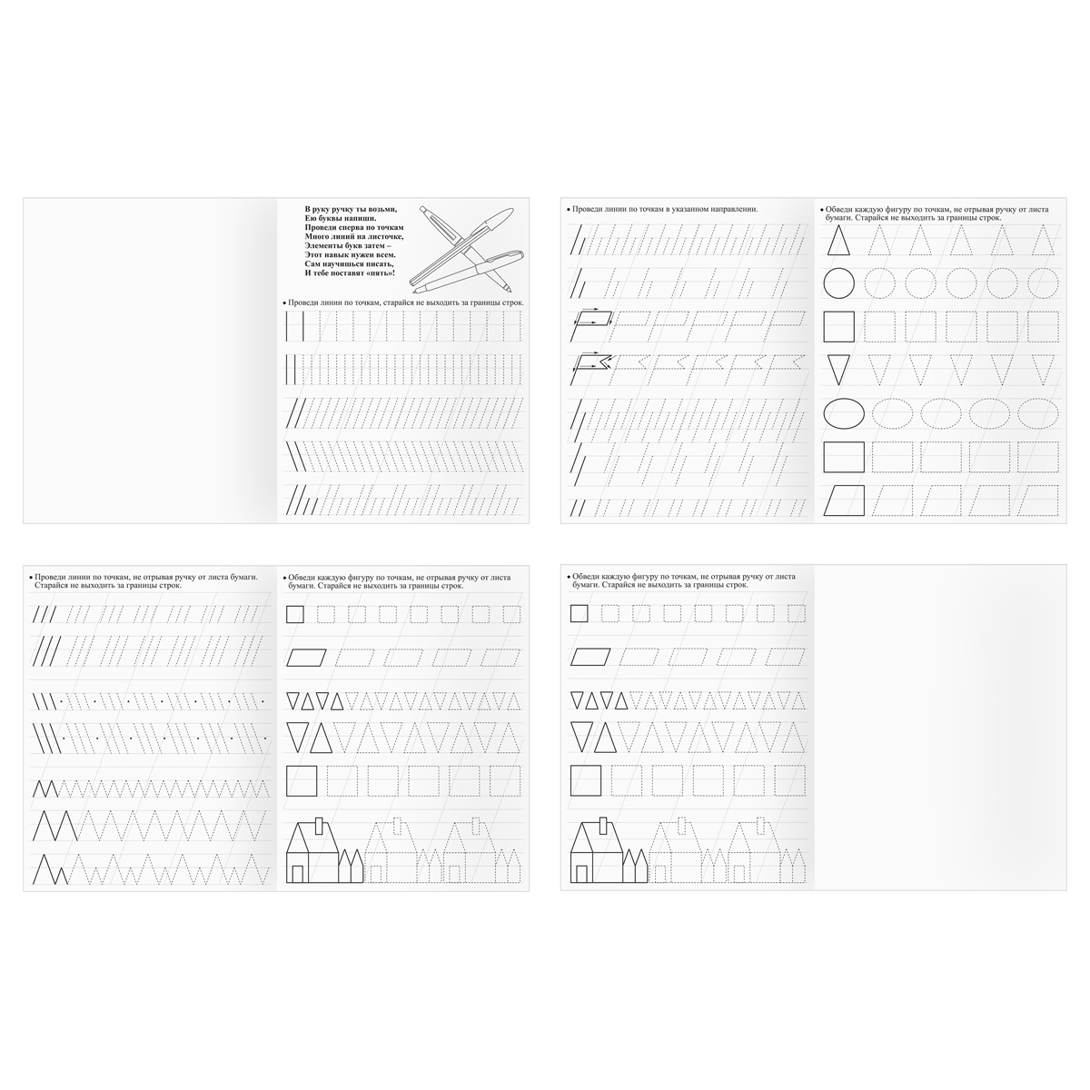 Ребёнка важно подготовить к письму ещё в дошкольном возрасте. И тренажёры для детей станут лучшим помощником в этом деле. Они научат малыша правильно ставить руку при письме. Благодаря тренажёру ребёнок научится красиво и аккуратно писать, что во многом облегчит ему обучение в школе. Кроме того, прописи для детей развивают мелкую моторику рук, координацию движений, внимание и память. А многие из них ещё и сопровождаются весёлыми играми, заданиями и стишками, что делает процесс обучения интересным и занимательным, а также прививает любовь к занятиям в школе. В данной серии представлены в запайке четыре прописи для детей возраста 4-5 лет на следующие темы: "Пишем по клеточкам", "Пишем по линеечкам", "Пишем по точкам", "Продолжи узор". Формат А5, 16 страниц черно-белых.