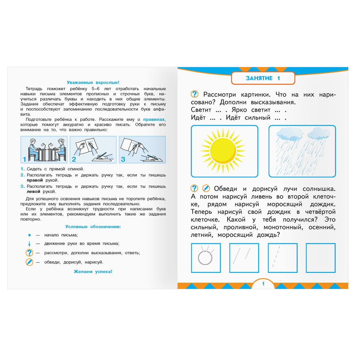 Перед вами тетрадь по обучению грамоте для детей 5-7 лет. Занимаясь по этой тетради, дети научатся определять количество букв и слогов в слове, определять ударный слог, составлять схемы предложений. В нижней части каждой странички дети потренируются в написании слогов, слов и предложений. Заниматься по тетради можно как индивидуально, так и с небольшой группой детей.