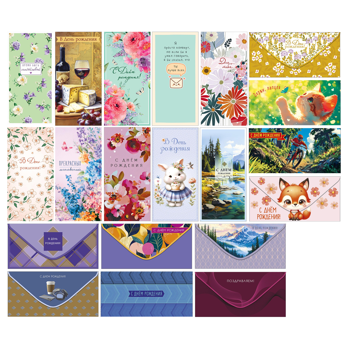 Красивая упаковка для денежных подарков. Конверты для денег с различными надписями на лицевой стороне, без отделки. Фасовка 20 дизайнов по 5 шт. Размер изделия: 167*83 мм.