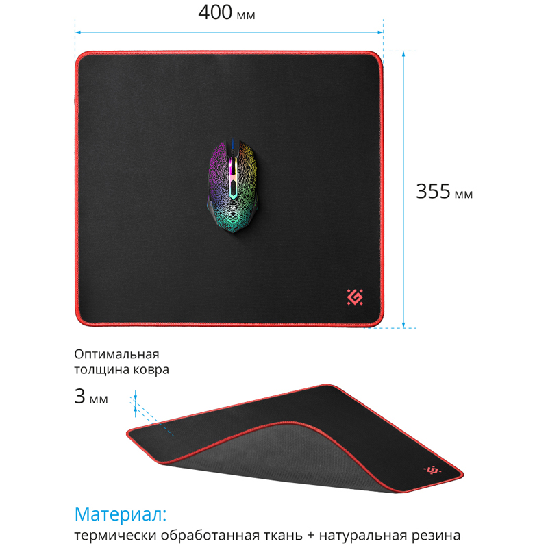 Гладкая поверхность Подходит для оптических и лазерных мышей с любой чувствительностью и любым типом сенсора Большой размер для удобной работы на низком разрешении Нескользящая каучуковая основа Надежно фиксируется на любой поверхности. Оптимальная толщина ковра - 3 мм Повышенная износостойкость Размер 360x270x3 мм