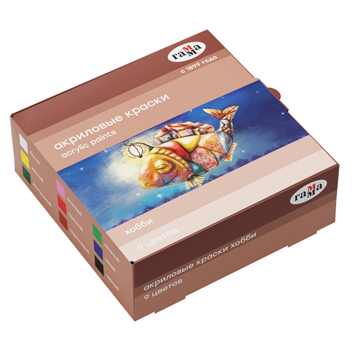 Акриловые краски серии «Хобби» предназначены для декоративно-оформительских работ и росписи бумаги, картона, холста, дерева, металла, гипса. Краски обладают высокой укрывистостью, хорошо смешиваются и быстро высыхают. После высыхания создают на поверхности глянцевый красочный слой. Акрил «Хобби» морозостиойкий, выдерживает транспортировку при низких температурах. Благодаря удобной герметичной баночке с завинчивающейся крышкой, краски долго хранятся, не высыхая. В наборе 9 цветов: белый, жёлтый, изумрудный, розовый, красный, коричневый, зелёный, синий, чёрный. Объём одной баночки — 20 мл, общий объём — 180 мл. • Количество цветов: 9; • Упаковка: баночка с крышкой; • Объём: 20 мл.
