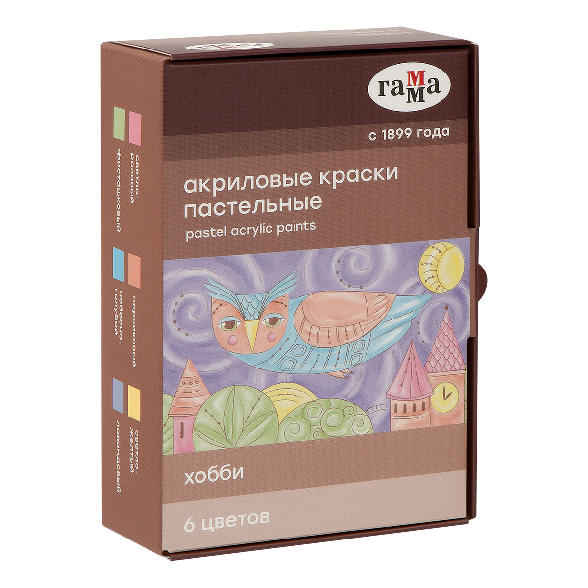 Набор художественных акриловых красок из 6 цветов. Отлично наносятся на различные поверхности: картон, грунтованный холст, плотную бумагу, металл, кожу, дерево. Прекрасно подходят для декоративных и дизайнерских работ. Упаковка - картонная коробка