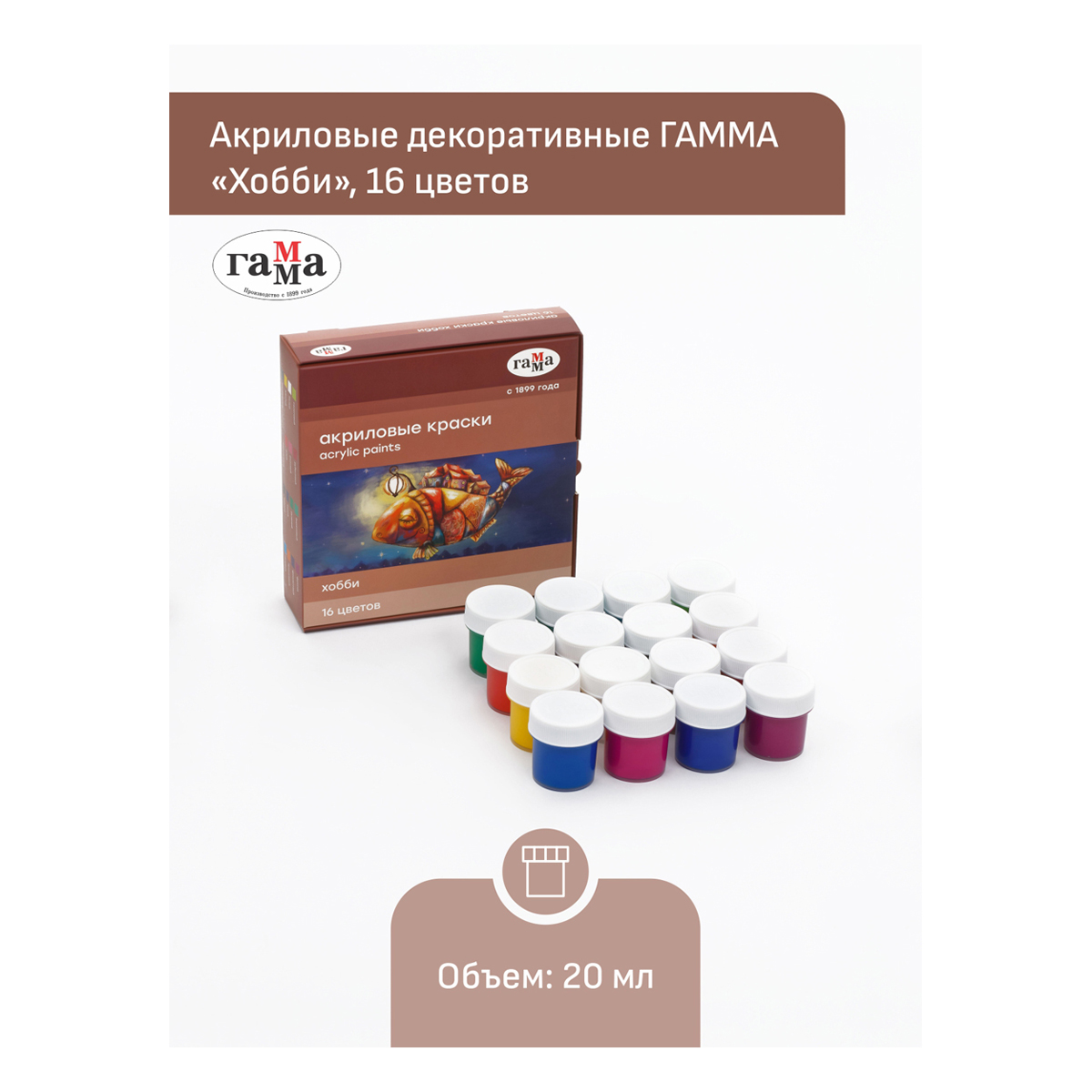 Акриловые краски серии «Хобби» предназначены для декоративно-оформительских работ и росписи бумаги, картона, холста, дерева, металла, гипса. Краски обладают высокой укрывистостью, хорошо смешиваются и быстро высыхают. После высыхания создают на поверхности глянцевый красочный слой. Акрил «Хобби» морозостиойкий, выдерживает транспортировку при низких температурах. Благодаря удобной герметичной баночке с завинчивающейся крышкой, краски долго хранятся, не высыхая. В набор входят 12 цветов: белый, жёлтый, изумрудный, розовый, красный, коричневый, зелёный, синий, чёрный, фиолетовый, оранжевый, голубой. Объём одной баночки — 20 мл, общий объём — 240 мл. На упаковке по QR-коду доступен мастер-класс. • Количество цветов: 12; • Упаковка: баночка с крышкой; • Объём: 20 мл.