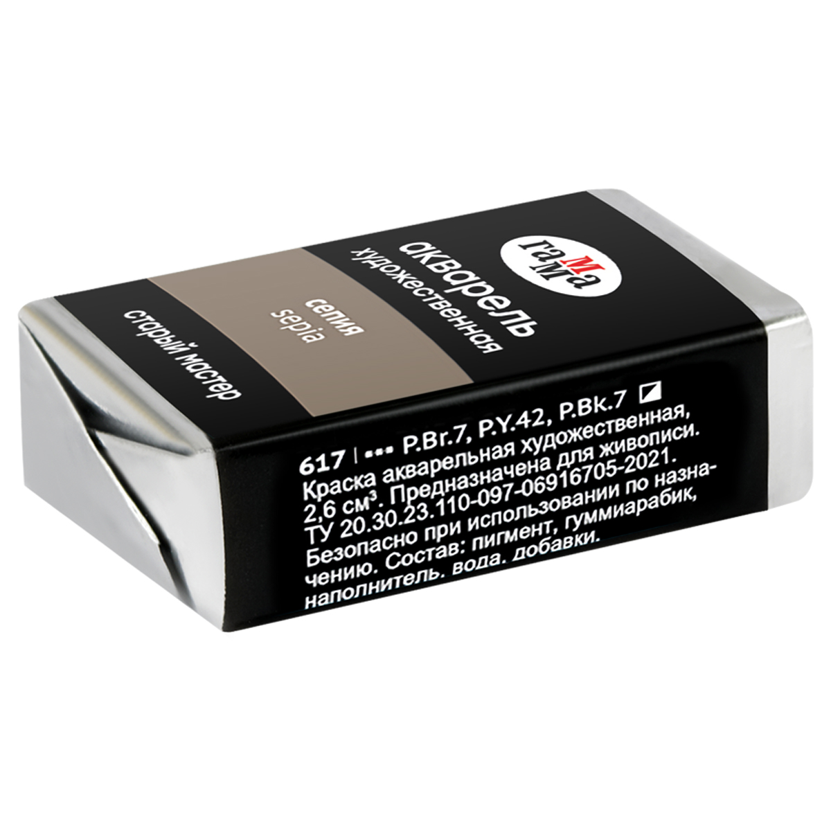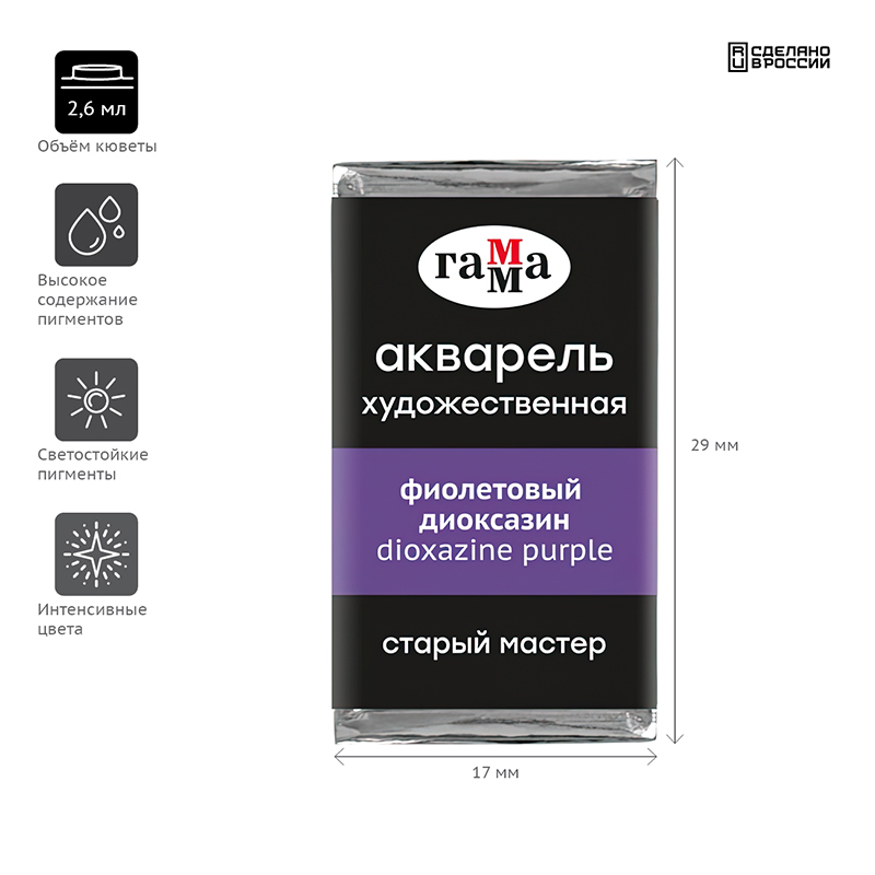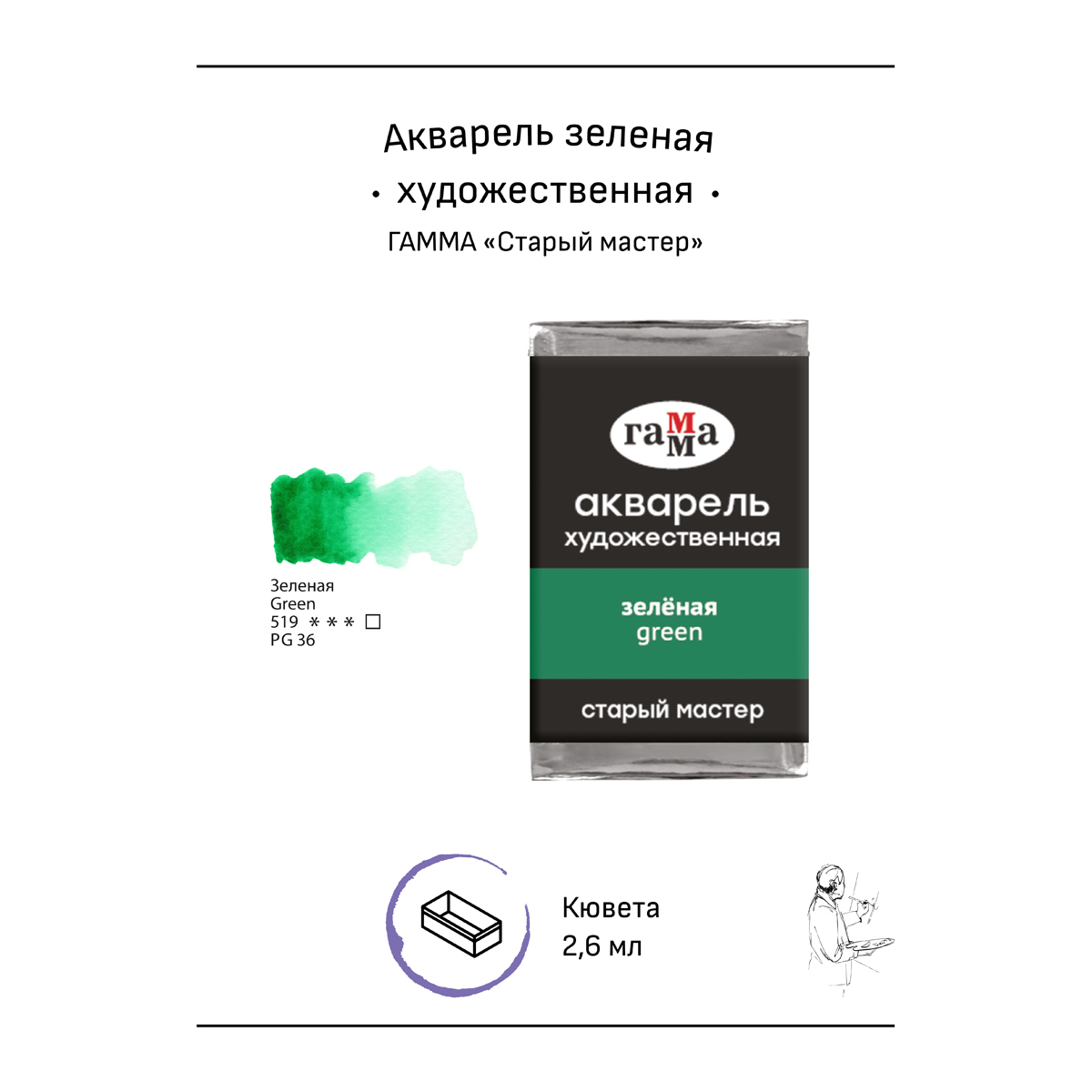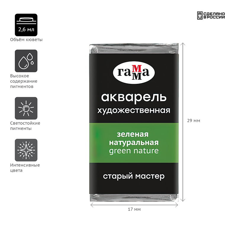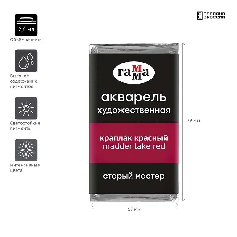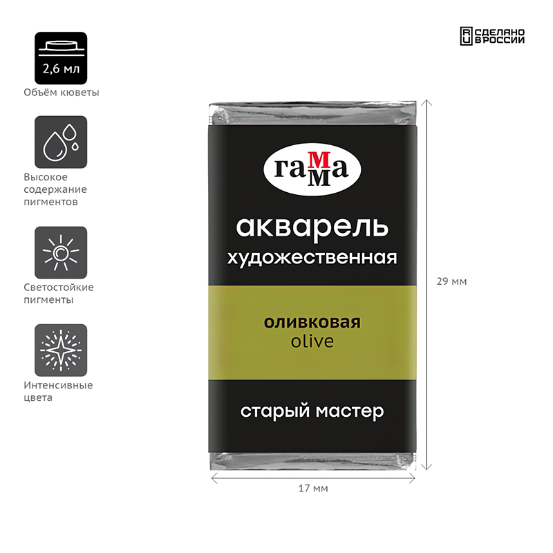 Рецептура профессиональных акварельных красок серии "Старый мастер" разработана в собственной исследовательской лаборатории завода. В составе красок гуммиарабик высшей степени очистки и высококачественные пигменты, которые обеспечивают насыщенность цветов, чистоту и прозрачность красочного слоя. Объем кюветы 2,6 мл.