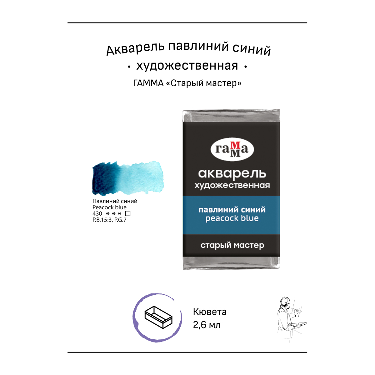 Профессиональная художественная акварель «ГАММА» серии «Старый мастер» упакована в новую кювету объёмом 2,6 мл. Цвет краски – павлиний синий. Рецептура профессиональной художественной акварели «Старый мастер» разработана в собственной исследовательской лаборатории завода. В составе красок гуммиарабик высшей степени очистки и высококачественные пигменты, которые обеспечивают насыщенность цветов, чистоту и прозрачность красочного слоя. Каждая кювета упакована в плёнку. • Цвет: павлиний синий; • Упаковка: кювета; • Объем кюветы: 2,6 мл.