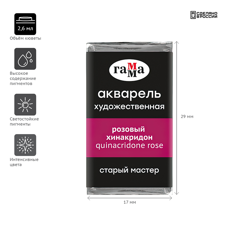 Профессиональная художественная акварель «ГАММА» серии «Старый мастер» в новой эргономичной кювете, объём − 2,6 мл, цвет – красно-розовый хинакридон. Профессиональная художественная акварель «ГАММА» в кюветах серии «Старый мастер» разработана в собственной исследовательской лаборатории завода совместно с профессиональными художниками. В составе красок гуммиарабик высшей степени очистки и высококачественные пигменты, которые обеспечивают насыщенность цветов, чистоту и прозрачность красочного слоя. Все цвета отлично смешиваются между собой, позволяя создавать новые оттенки. Обновлённая форма кюветы более эргономична и удобна для использования. Линейка представлена в наборах 12, 24, 36 цветов и поштучно. • Цвет: красно-розовый хинакридон; • Упаковка: кювета; • Объем кюветы: 2,6 мл.