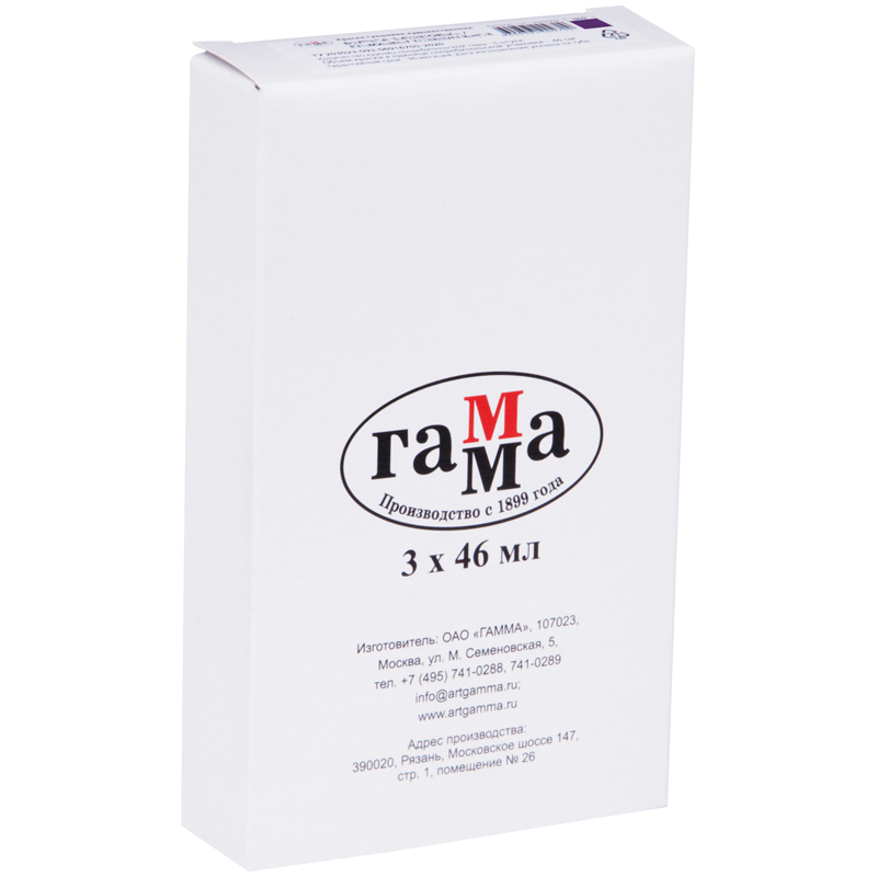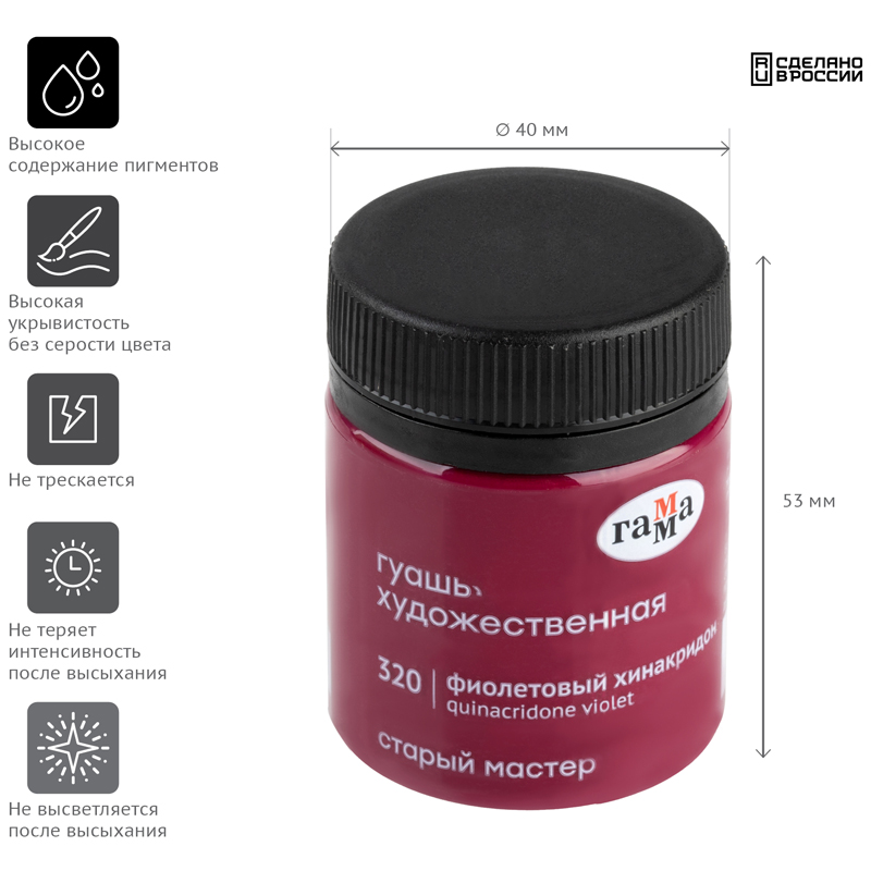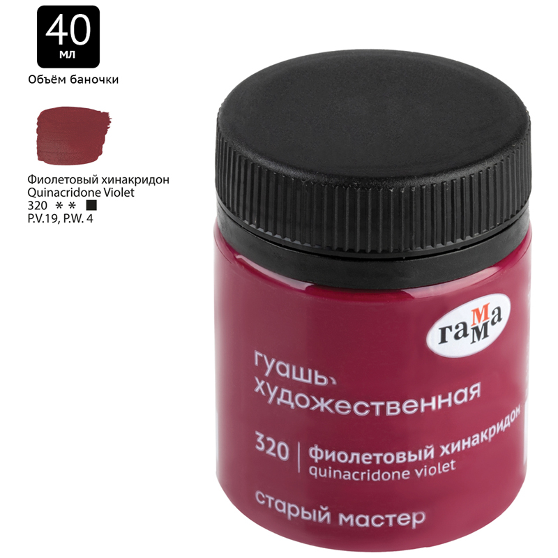 Гуашь художественная "Гамма" серии "Старый мастер" имеет уникальную рецептуру, разработанную в собственной исследовательской лаборатории завода совместно с художниками. Краски изготавливается из тонкодиспесных пигментов, связующего, в состав которого входит раствор растительного клея - гуммиарабика высшей степени очистки. Краска легко наносится на поверхность, благодаря специальным добавкам сохраняет яркость цвета после высыхания, создавая плотный бархатистый слой. Гуашь обладает высокой укрывистостью, отличной разносимостью, а также хорошо смешивается между собой. Большая часть цветов имеет самый высокий показатель светостойкости.