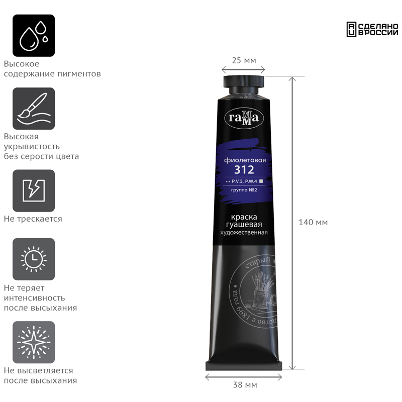 Гуашь художественная «Старый Мастер» - это профессиональные тонкотертые водорастворимые краски. Гуашь имеет уникальную рецептуру, разработанную в собственной исследовательской лаборатории завода совместно с художниками. Краска легко наносится на поверхность, благодаря специальным добавкам сохраняет яркость цвета после высыхания, создает плотный бархатный слой. Гуашь изготовлена из традиционных художественных пигментов, в том числе пигментов кадмиево-кобальтовой группы. Большая часть цветов имеет самый высокий показатель светостойкости – 100 лет музейного хранения. В коллекции 13 цветов, упакованных в алюминиевые тубы объемом 46 мл для длительного сохранения свежести и яркости краски.