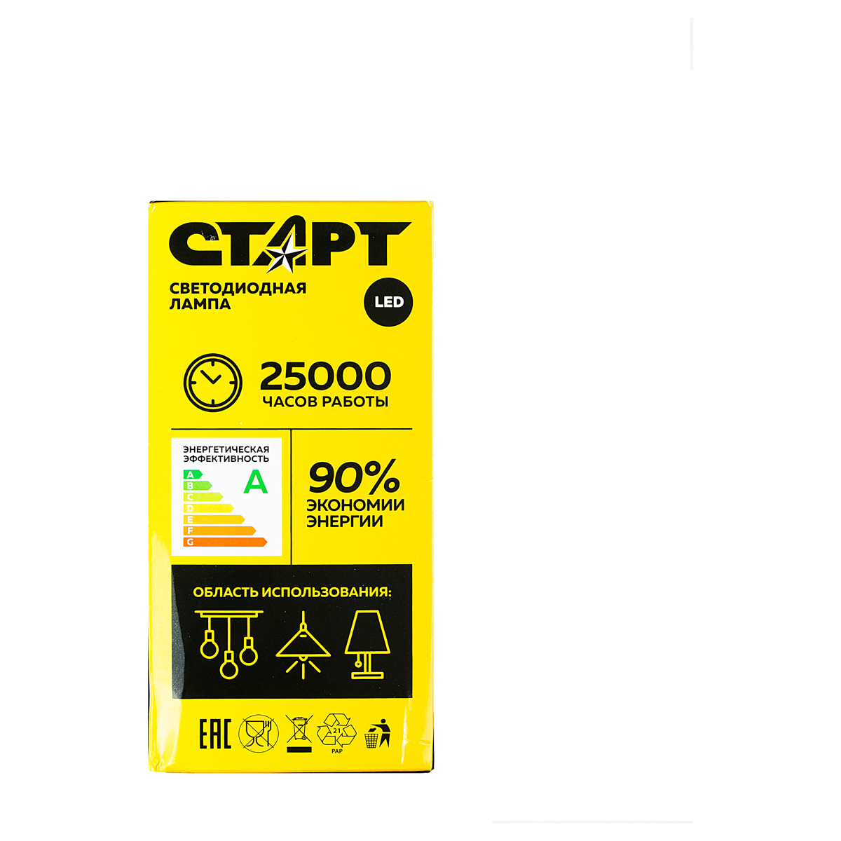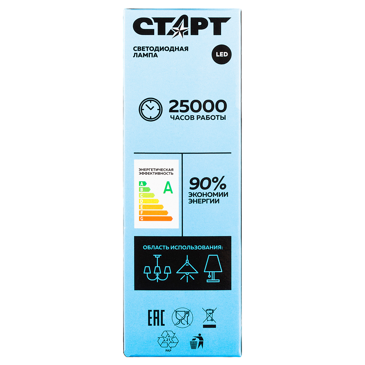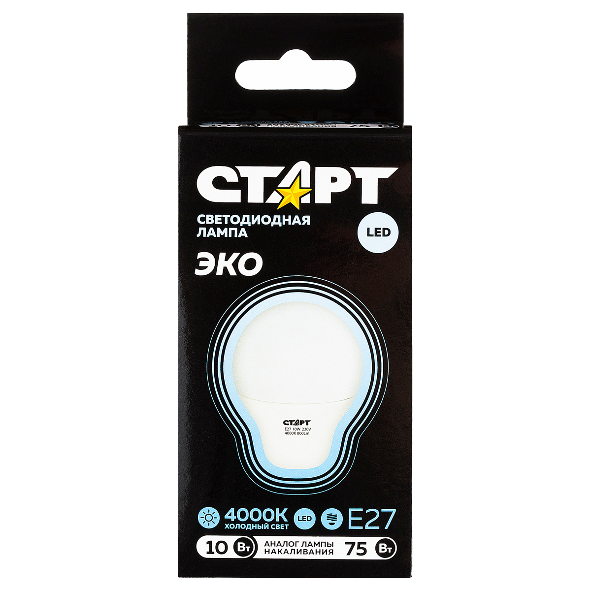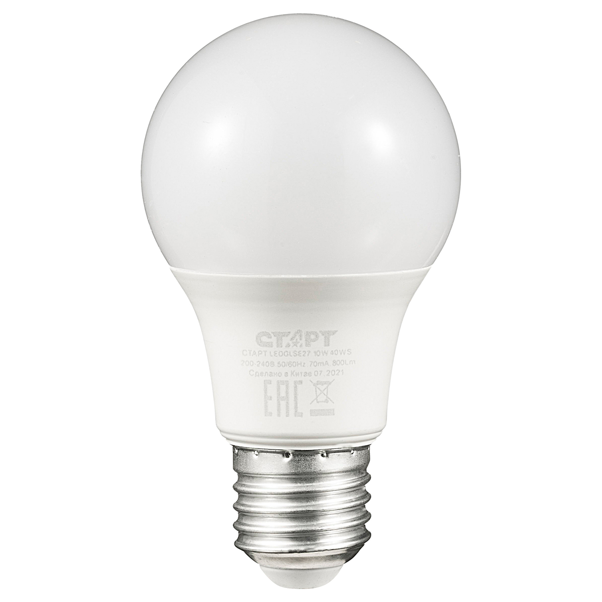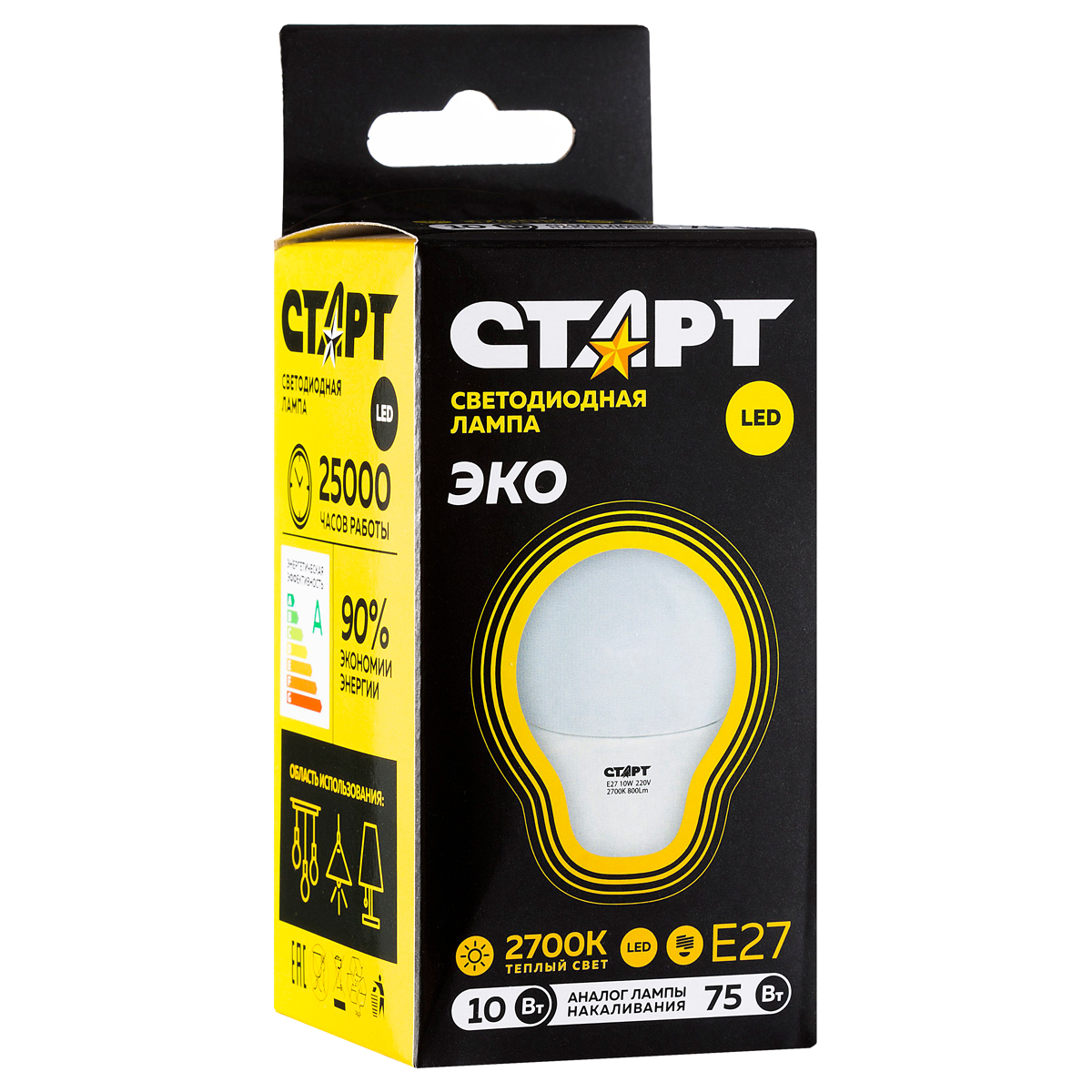 Светодиодная лампа СТАРТ является оптимальной заменой ламп накаливания и галогеновых ламп. Обеспечивает равномерное освещение, не раздражающее глаза, имеет нечувствительность к перепадам напряжения и приносит существенную экономию по энергозатратам при постоянной эксплуатации. Эстетика и удобство использования Среди преимуществ лампы матовый рассеиватель, дающий равномерный яркий и естественный свет в помещении, а также герметичное исполнение, позволяющее использовать лампу в уличных светильниках и комнатах с повышенной влажностью. Стандартный цоколь Е27 применим ко всем видам осветительных приборов. Экономия Благодаря светодиодам и особой системе управления лампа способна проработать до 25 000 часов. При низких энергозатратах в 10 Вт она экономит до 90% электроэнергии по сравнению с лампами накаливания. При этом уровень освещения эквивалентен обычнойлампе мощностью 75Вт. Безопасность Лампы производятся из нетоксичных материалов и могут эксплуатироваться в любых помещениях, включая детские и спальни. Светодиоды защищены от перегрева и перепадов напряжения. По окончанию срока службы лампы могут быть утилизированы и переработаны без специализированных средств.
