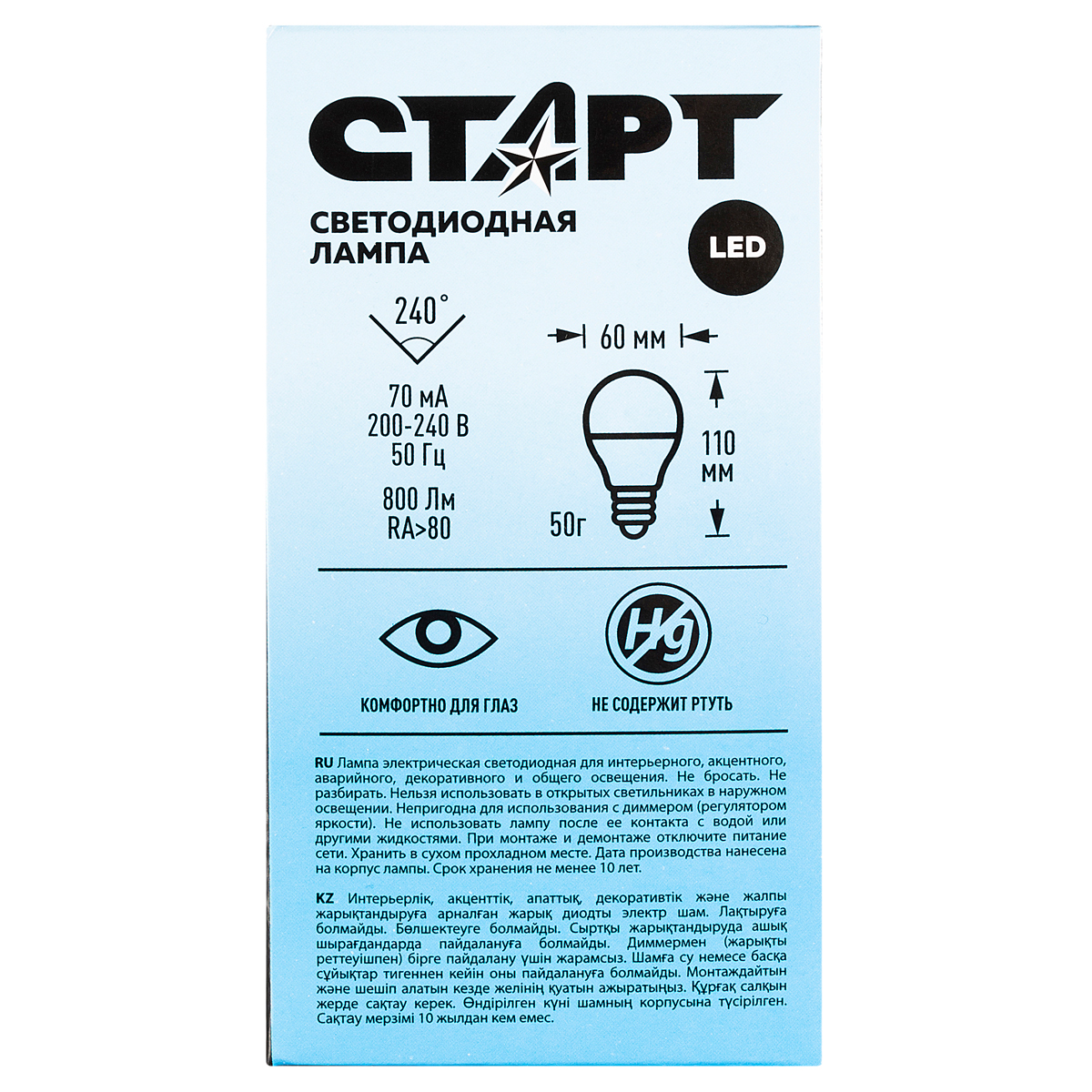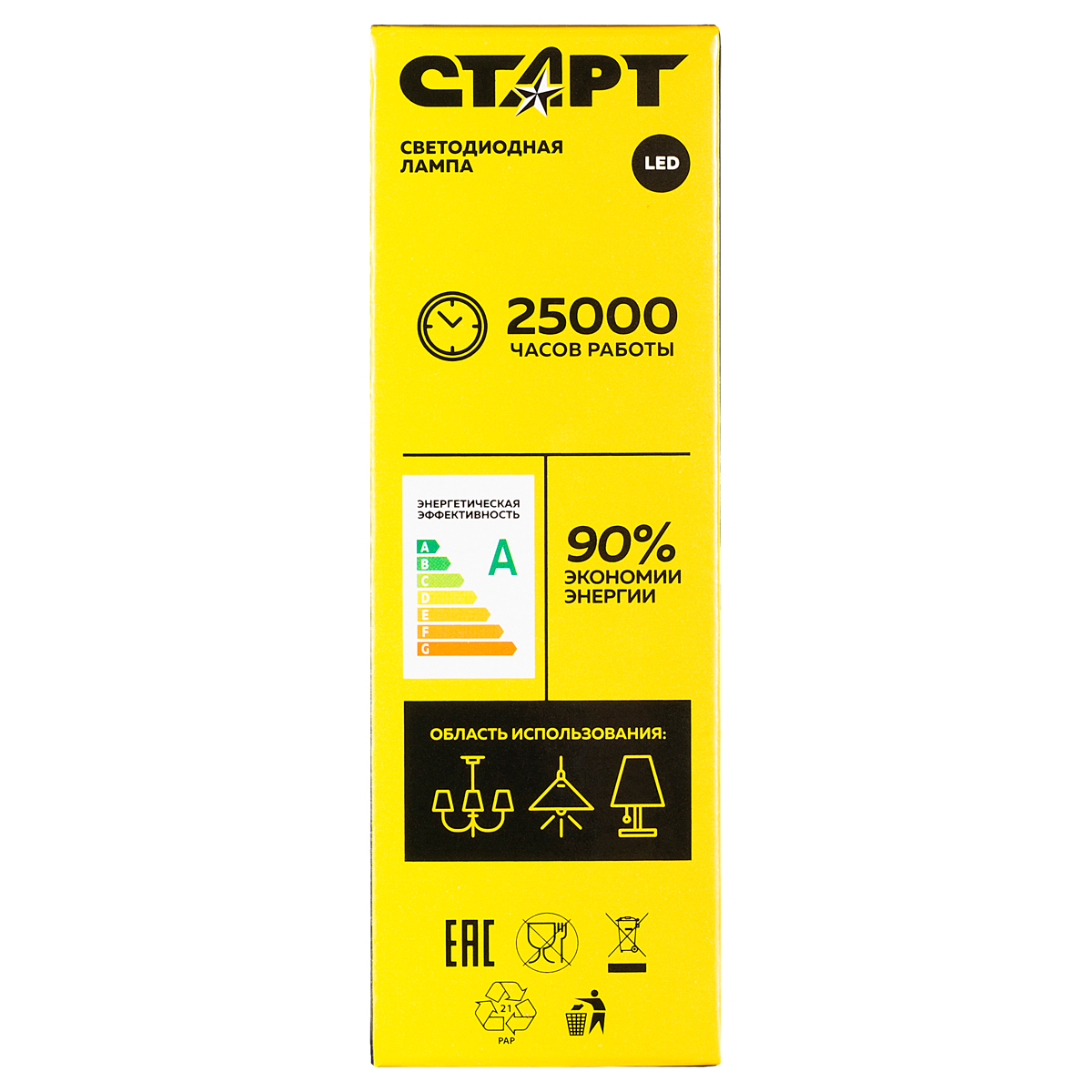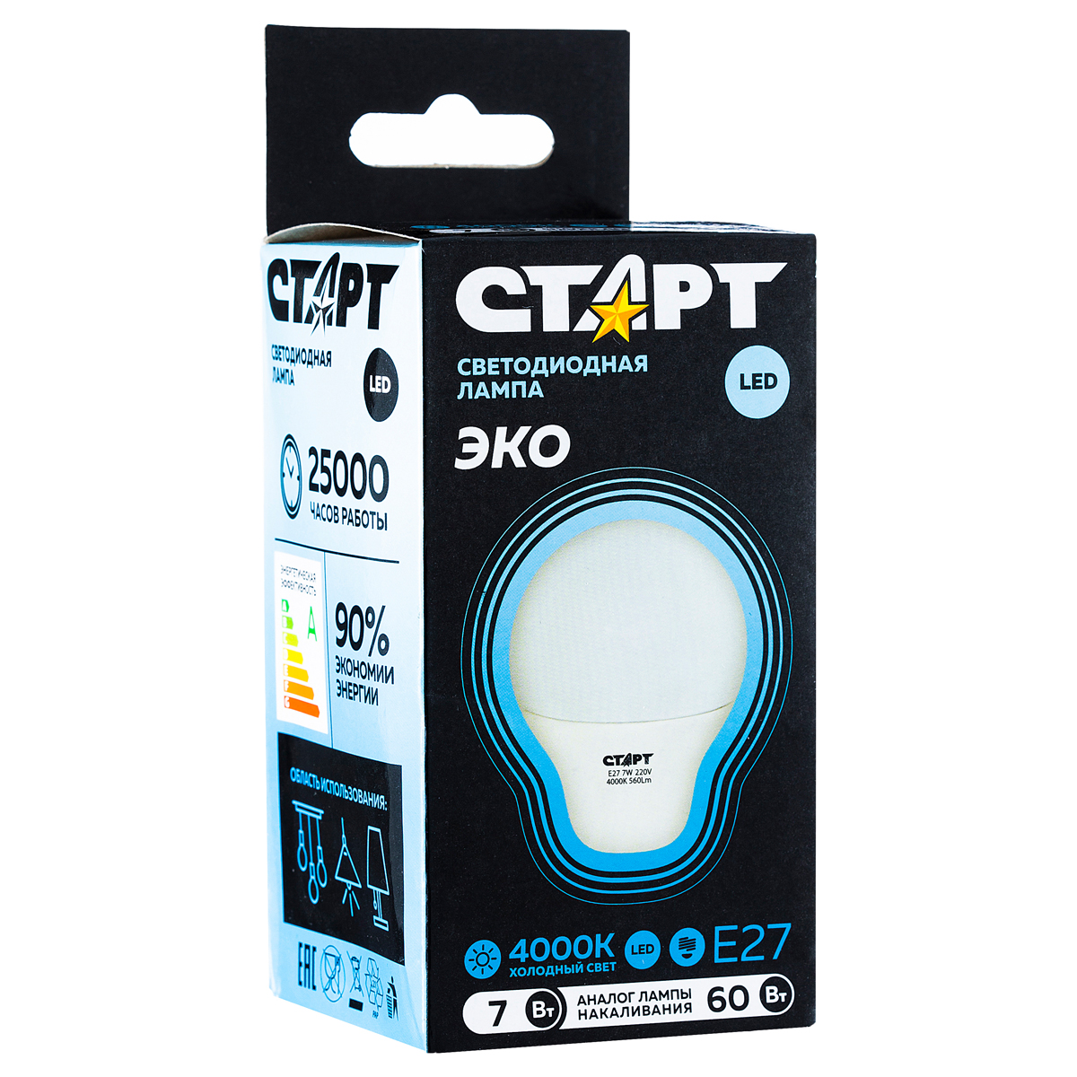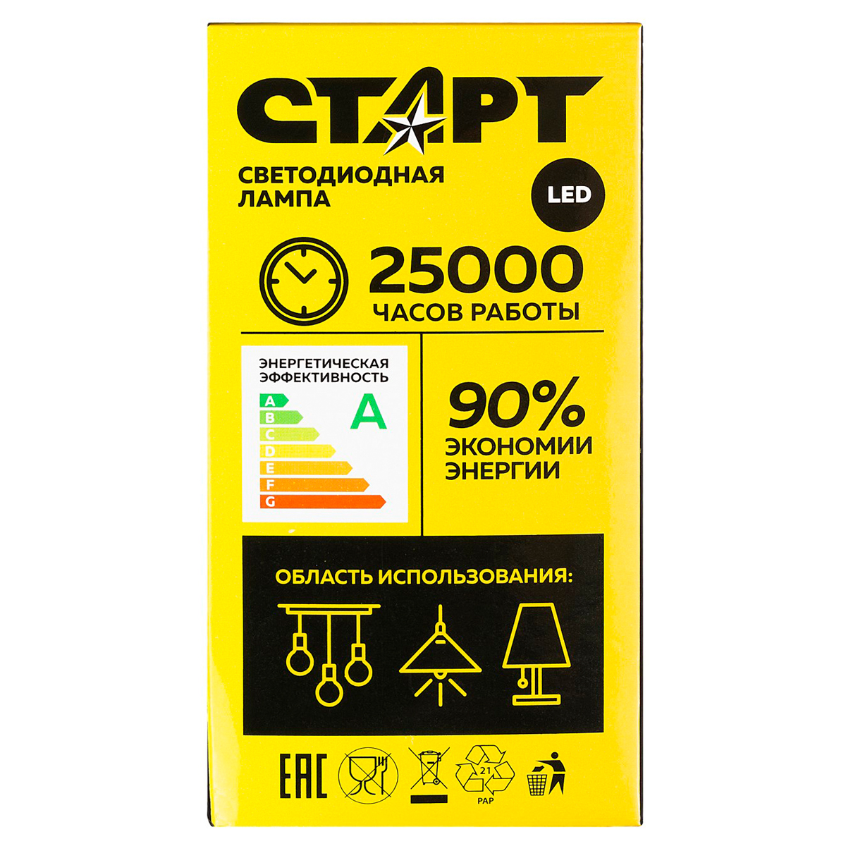 Светодиодная лампа СТАРТ является оптимальной заменой ламп накаливания и галогеновых ламп. Обеспечивает равномерное освещение, не раздражающее глаза, имеет нечувствительность к перепадам напряжения и приносит существенную экономию по энергозатратам при постоянной эксплуатации. Эстетика и удобство использования Среди преимуществ лампы матовый рассеиватель, дающий равномерный яркий и естественный свет в помещении, а также герметичное исполнение, позволяющее использовать лампу в уличных светильниках и комнатах с повышенной влажностью. Стандартный цоколь Е27 применим ко всем видам осветительных приборов. Экономия Благодаря светодиодам и особой системе управления лампа способна проработать до 25 000 часов. При низких энергозатратах в 10 Вт она экономит до 90% электроэнергии по сравнению с лампами накаливания. При этом уровень освещения эквивалентен обычнойлампе мощностью 75Вт. Безопасность Лампы производятся из нетоксичных материалов и могут эксплуатироваться в любых помещениях, включая детские и спальни. Светодиоды защищены от перегрева и перепадов напряжения. По окончанию срока службы лампы могут быть утилизированы и переработаны без специализированных средств.