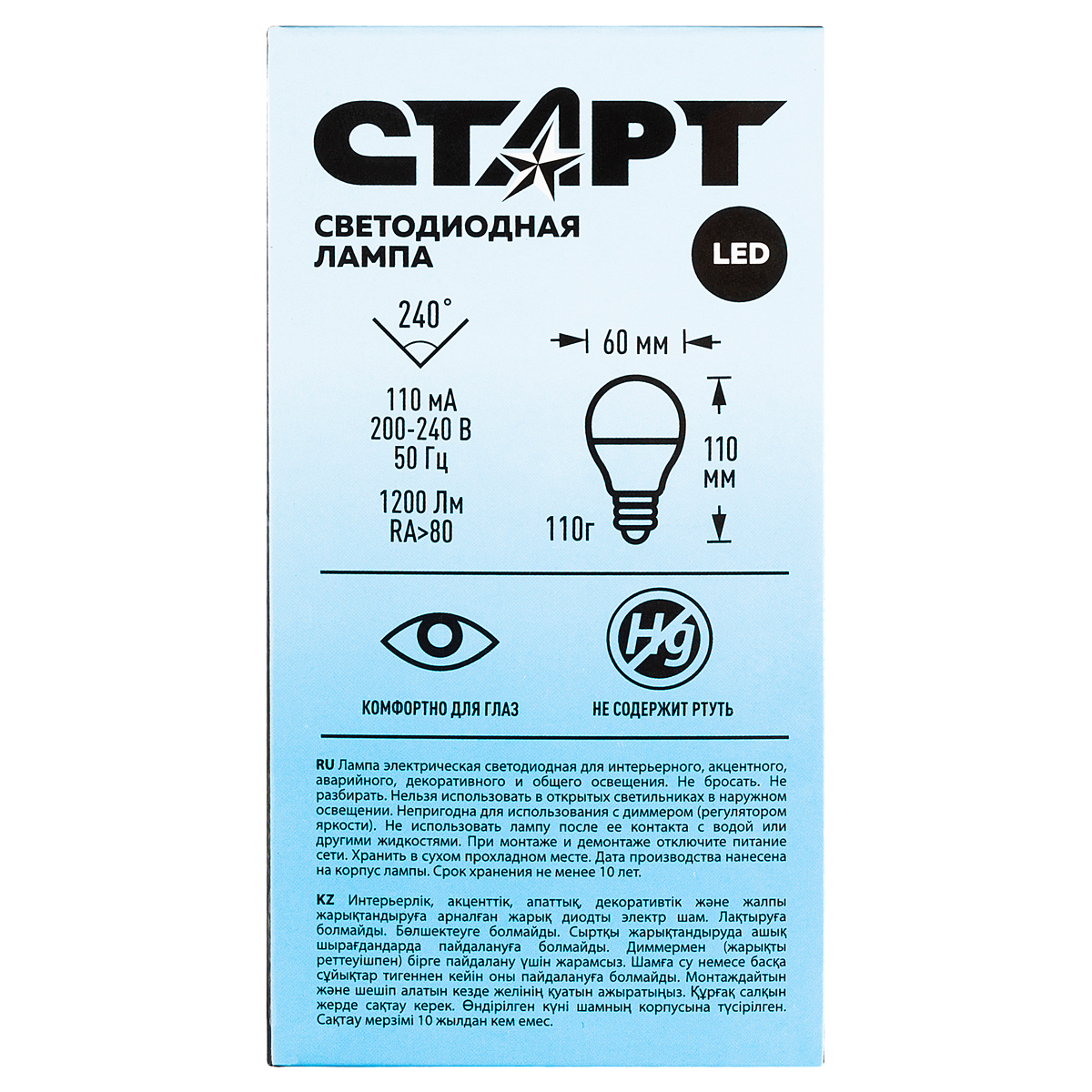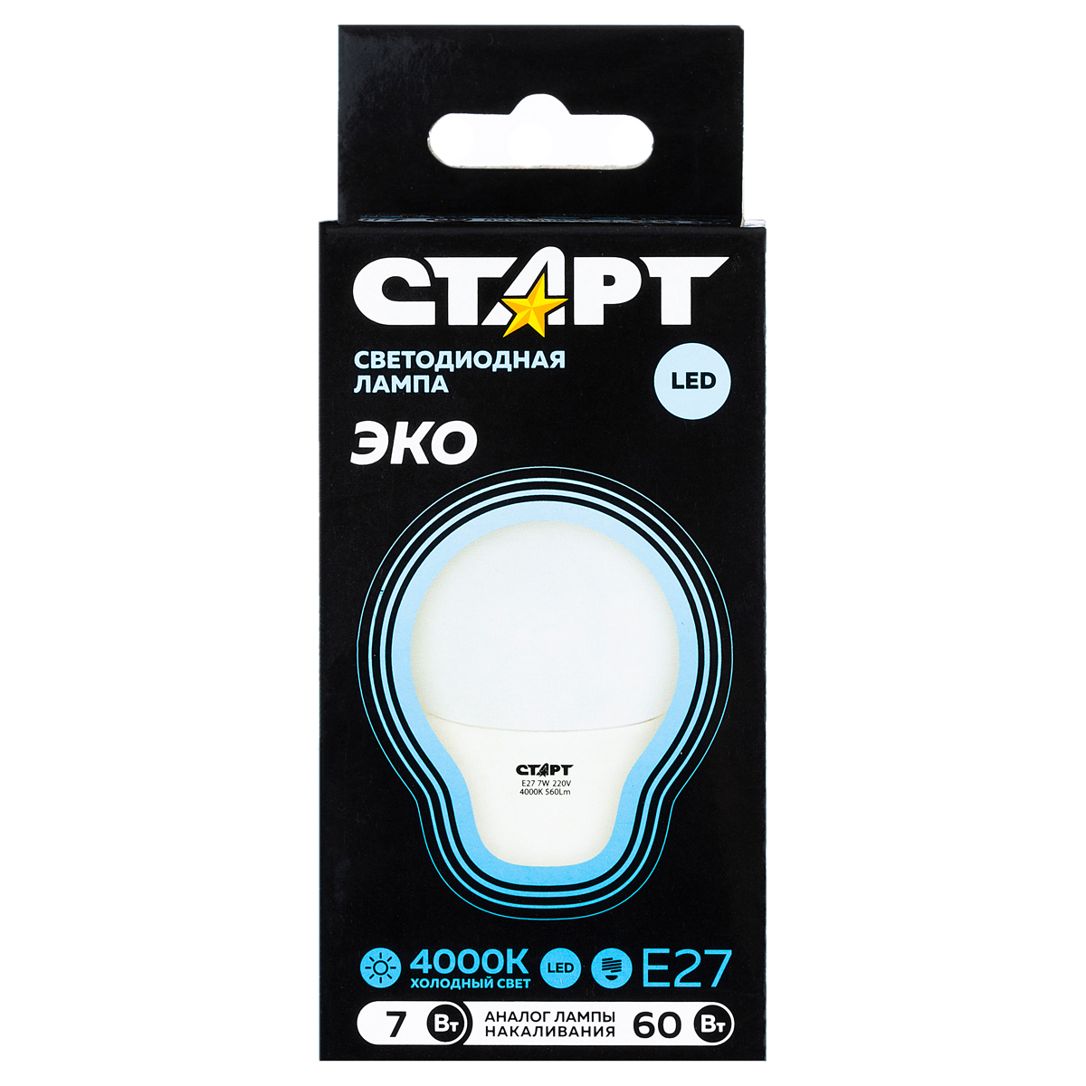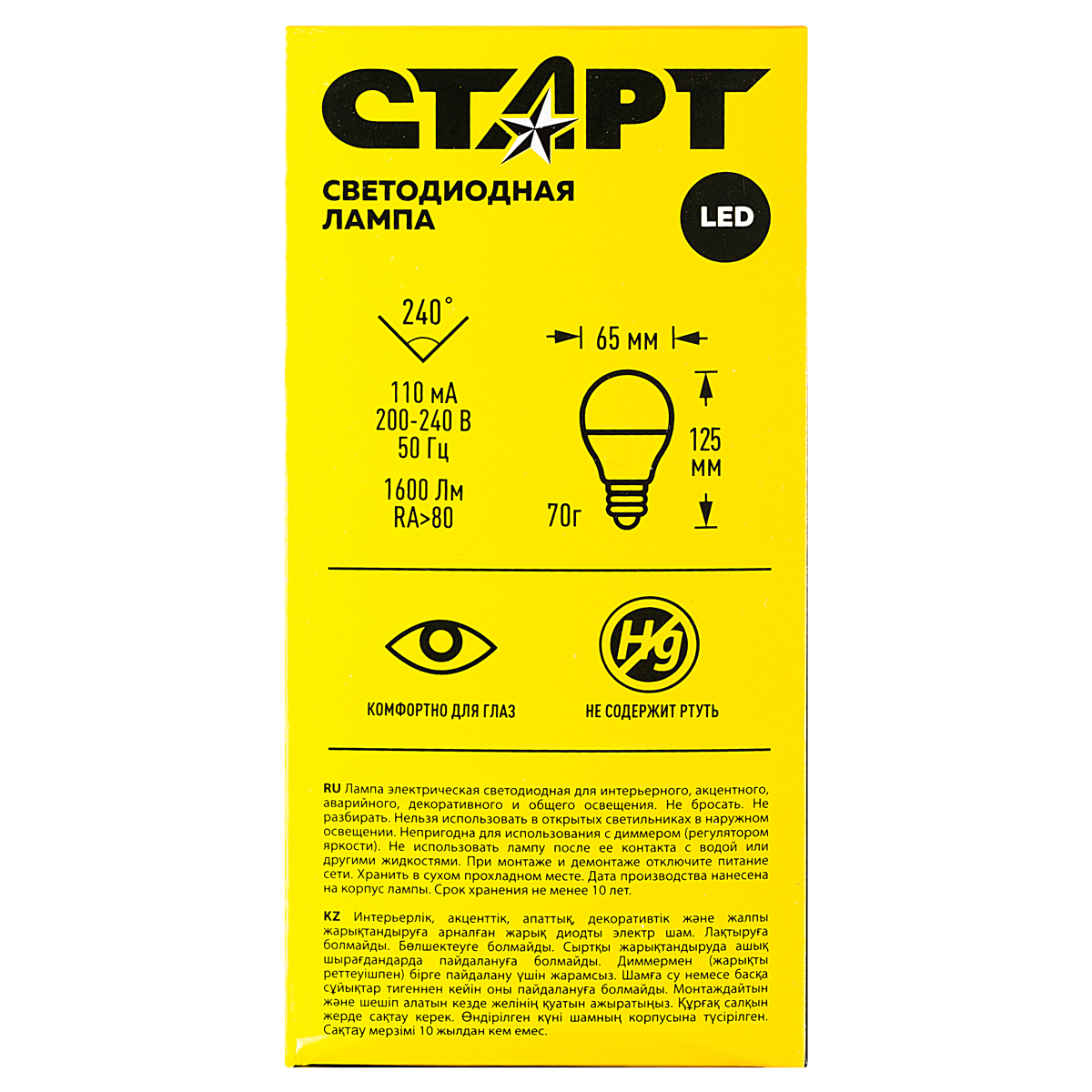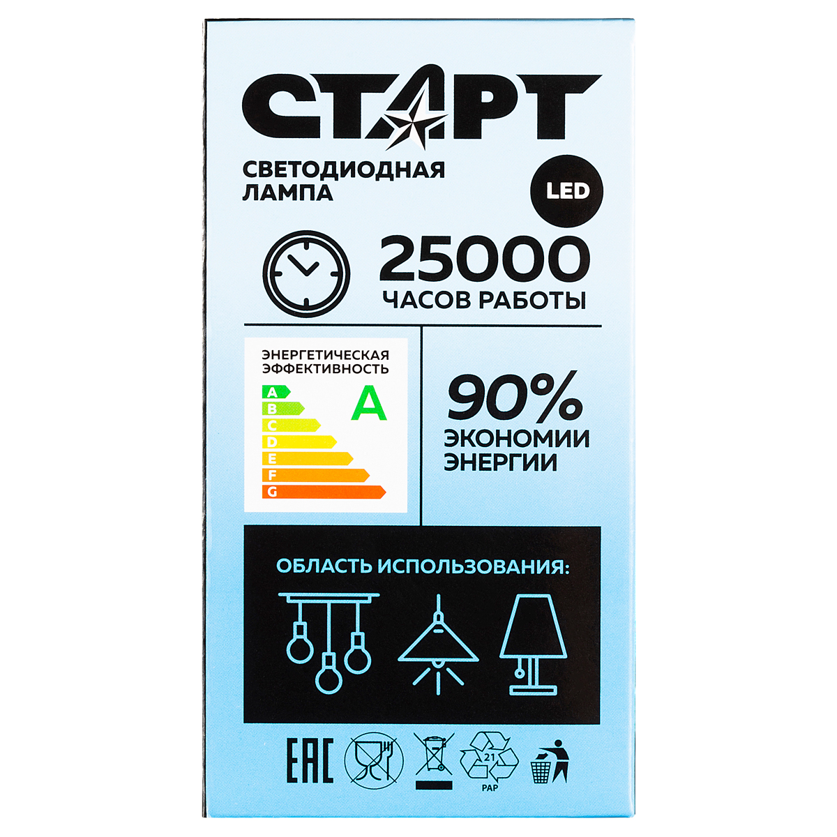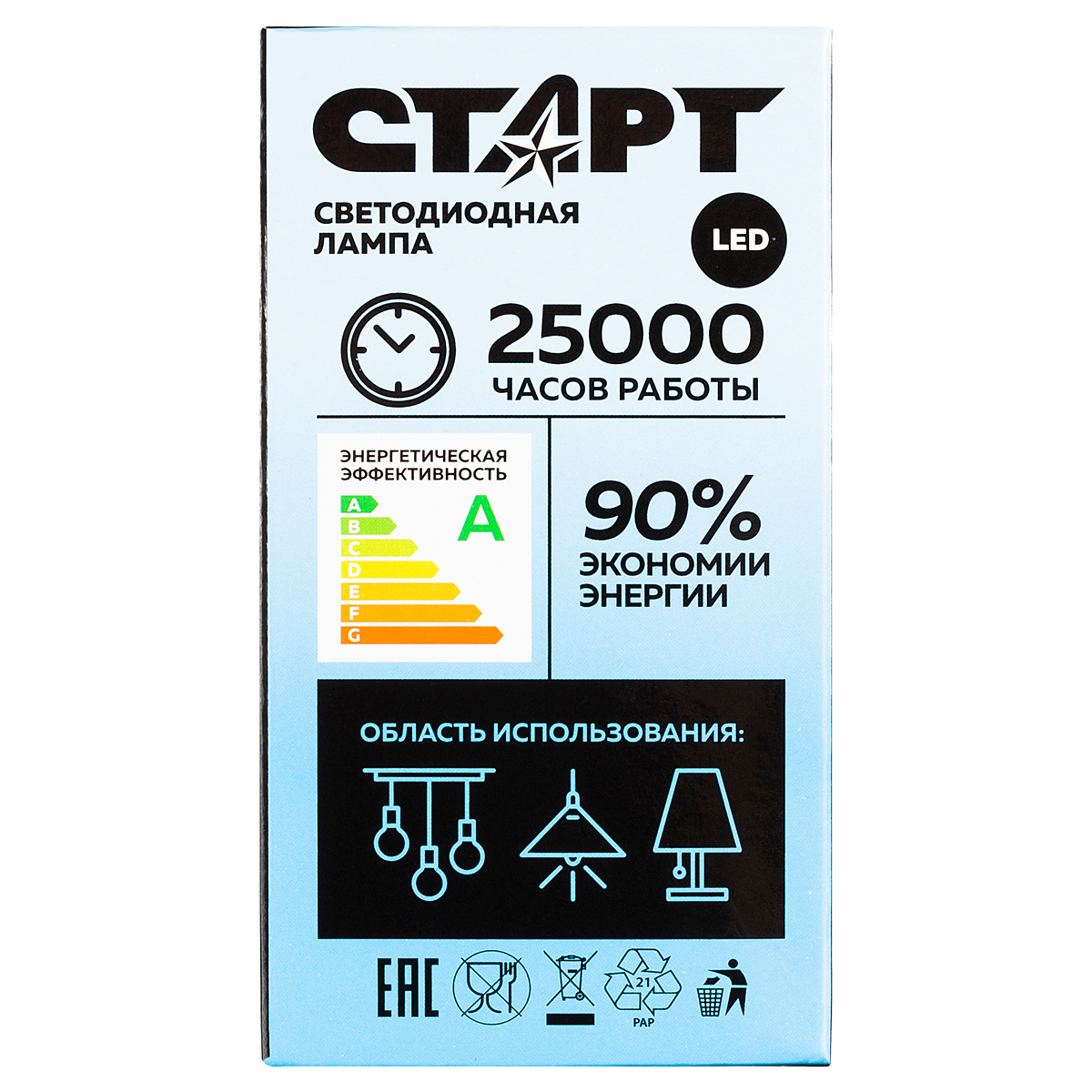 Светодиодная лампа СТАРТ является оптимальной заменой ламп накаливания и галогеновых ламп. Обеспечивает равномерное освещение, не раздражающее глаза, имеет нечувствительность к перепадам напряжения и приносит существенную экономию по энергозатратам при постоянной эксплуатации. Эстетика и удобство использования Среди преимуществ лампы матовый рассеиватель, дающий равномерный яркий и естественный свет в помещении, а также герметичное исполнение, позволяющее использовать лампу в уличных светильниках и комнатах с повышенной влажностью. Стандартный цоколь Е27 применим ко всем видам осветительных приборов. Экономия Благодаря светодиодам и особой системе управления лампа способна проработать до 25 000 часов. При низких энергозатратах в 10 Вт она экономит до 90% электроэнергии по сравнению с лампами накаливания. При этом уровень освещения эквивалентен обычнойлампе мощностью 75Вт. Безопасность Лампы производятся из нетоксичных материалов и могут эксплуатироваться в любых помещениях, включая детские и спальни. Светодиоды защищены от перегрева и перепадов напряжения. По окончанию срока службы лампы могут быть утилизированы и переработаны без специализированных средств.