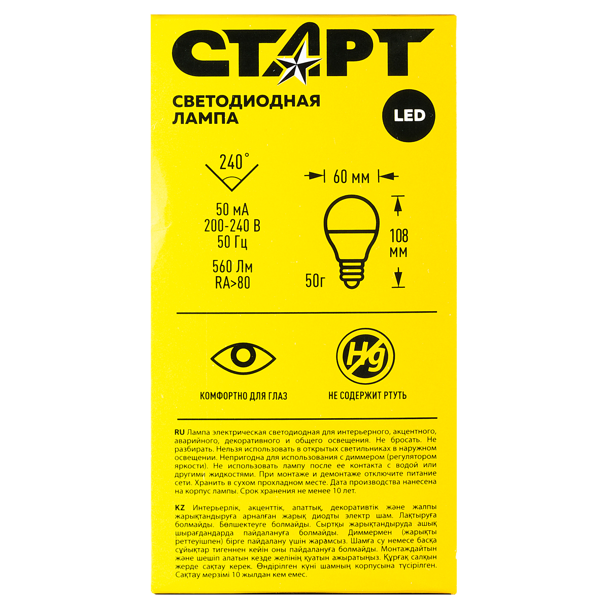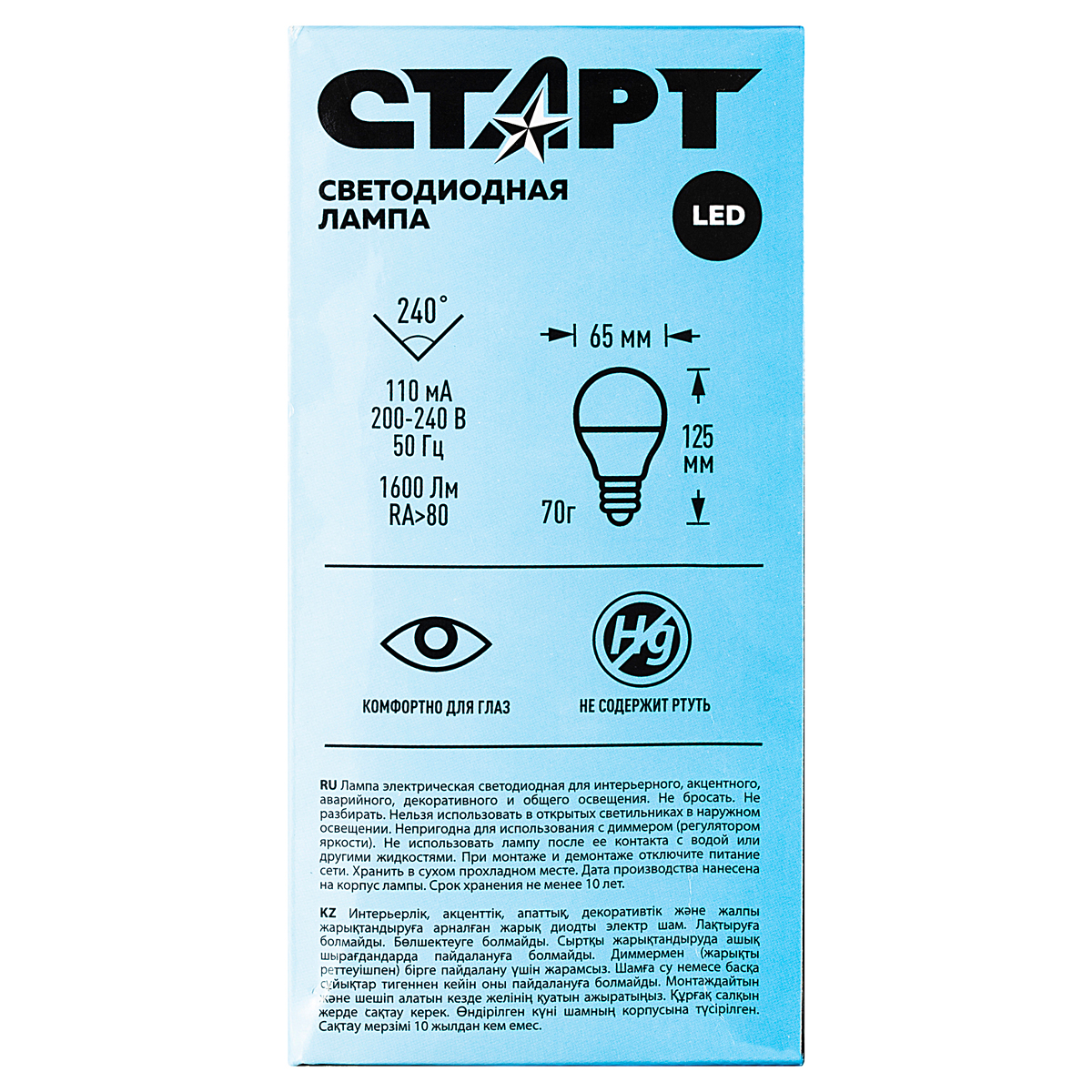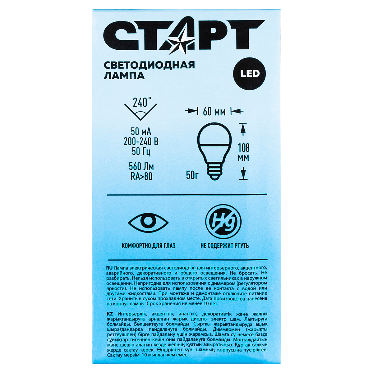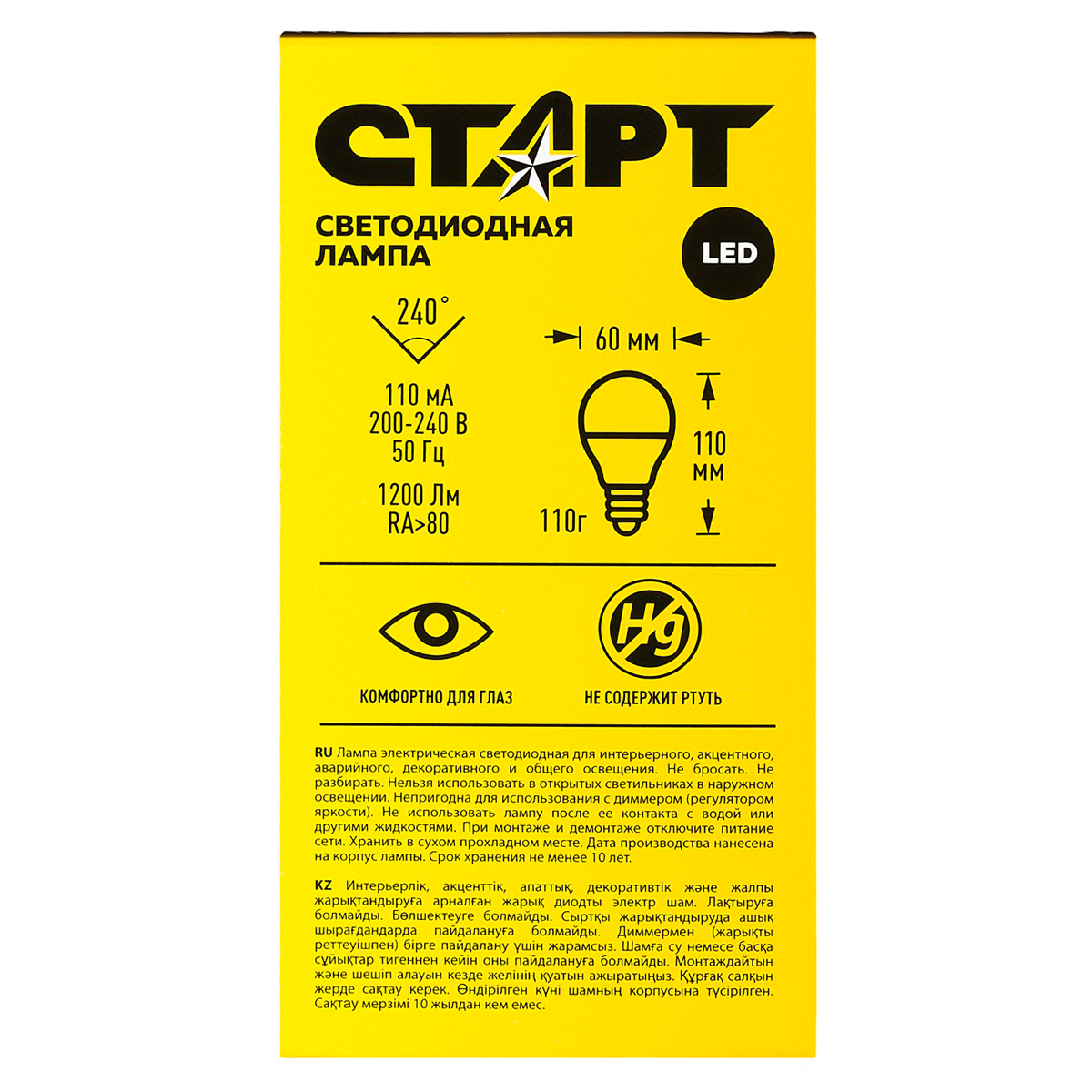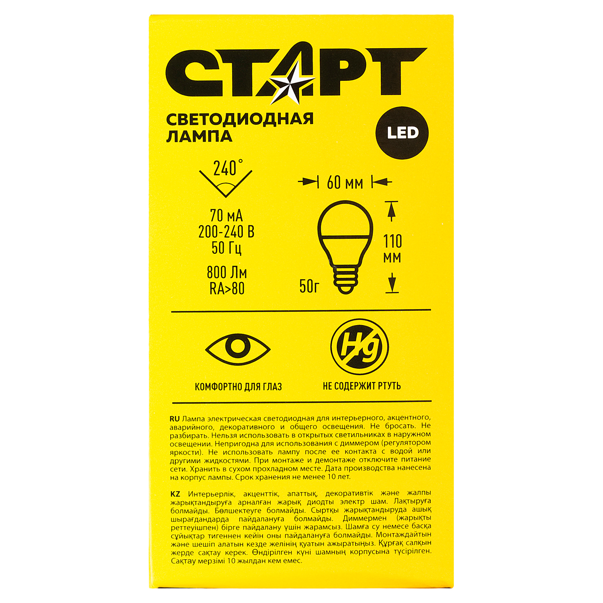 Светодиодная лампа СТАРТ является оптимальной заменой ламп накаливания и галогеновых ламп. Обеспечивает равномерное освещение, не раздражающее глаза, имеет нечувствительность к перепадам напряжения и приносит существенную экономию по энергозатратам при постоянной эксплуатации. Эстетика и удобство использования Среди преимуществ лампы матовый рассеиватель, дающий равномерный яркий и естественный свет в помещении, а также герметичное исполнение, позволяющее использовать лампу в уличных светильниках и комнатах с повышенной влажностью. Стандартный цоколь Е27 применим ко всем видам осветительных приборов. Экономия Благодаря светодиодам и особой системе управления лампа способна проработать до 25 000 часов. При низких энергозатратах в 10 Вт она экономит до 90% электроэнергии по сравнению с лампами накаливания. При этом уровень освещения эквивалентен обычнойлампе мощностью 75Вт. Безопасность Лампы производятся из нетоксичных материалов и могут эксплуатироваться в любых помещениях, включая детские и спальни. Светодиоды защищены от перегрева и перепадов напряжения. По окончанию срока службы лампы могут быть утилизированы и переработаны без специализированных средств.